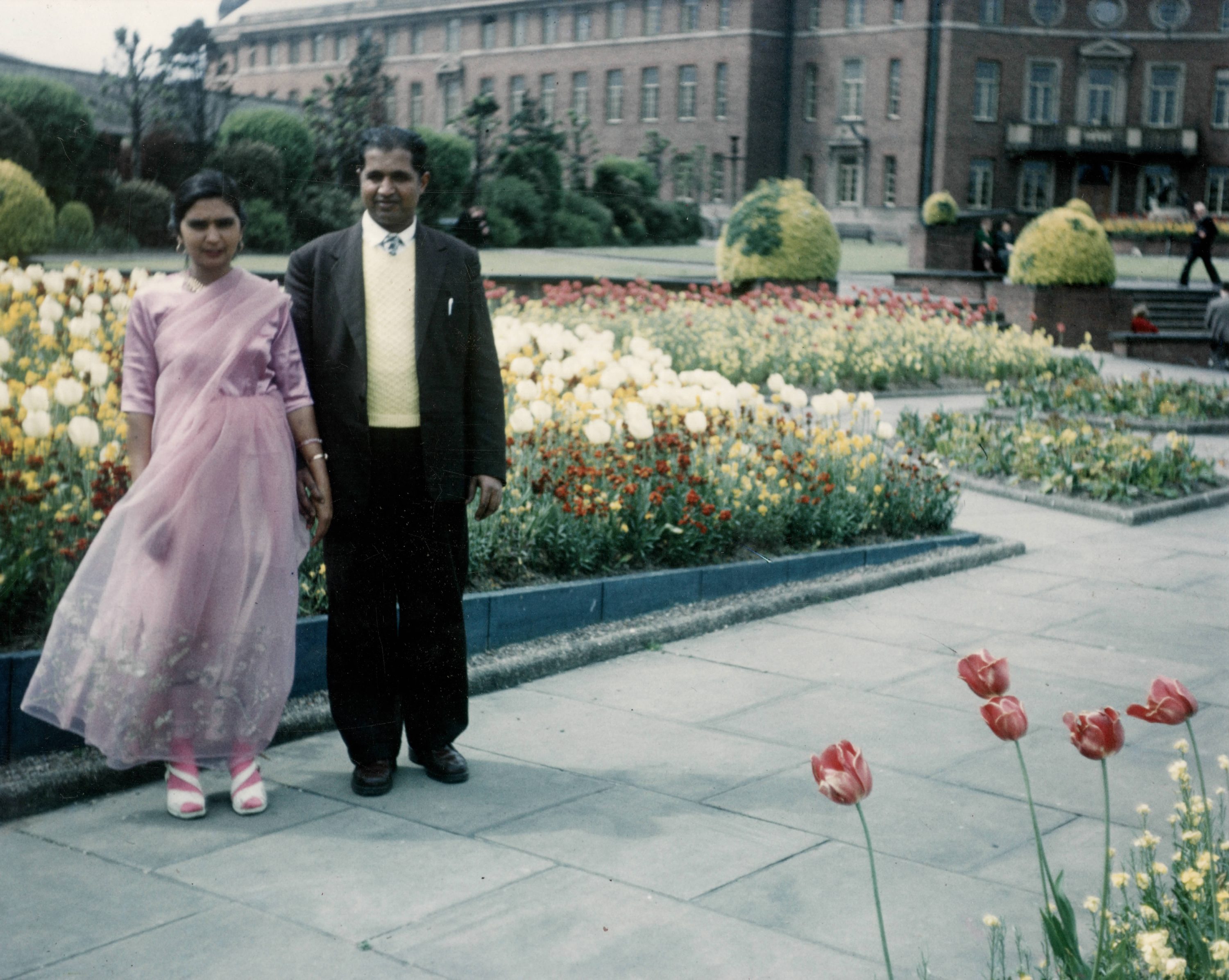 A couple pose for a photo in Derby River Gardens, with the council building in the background.