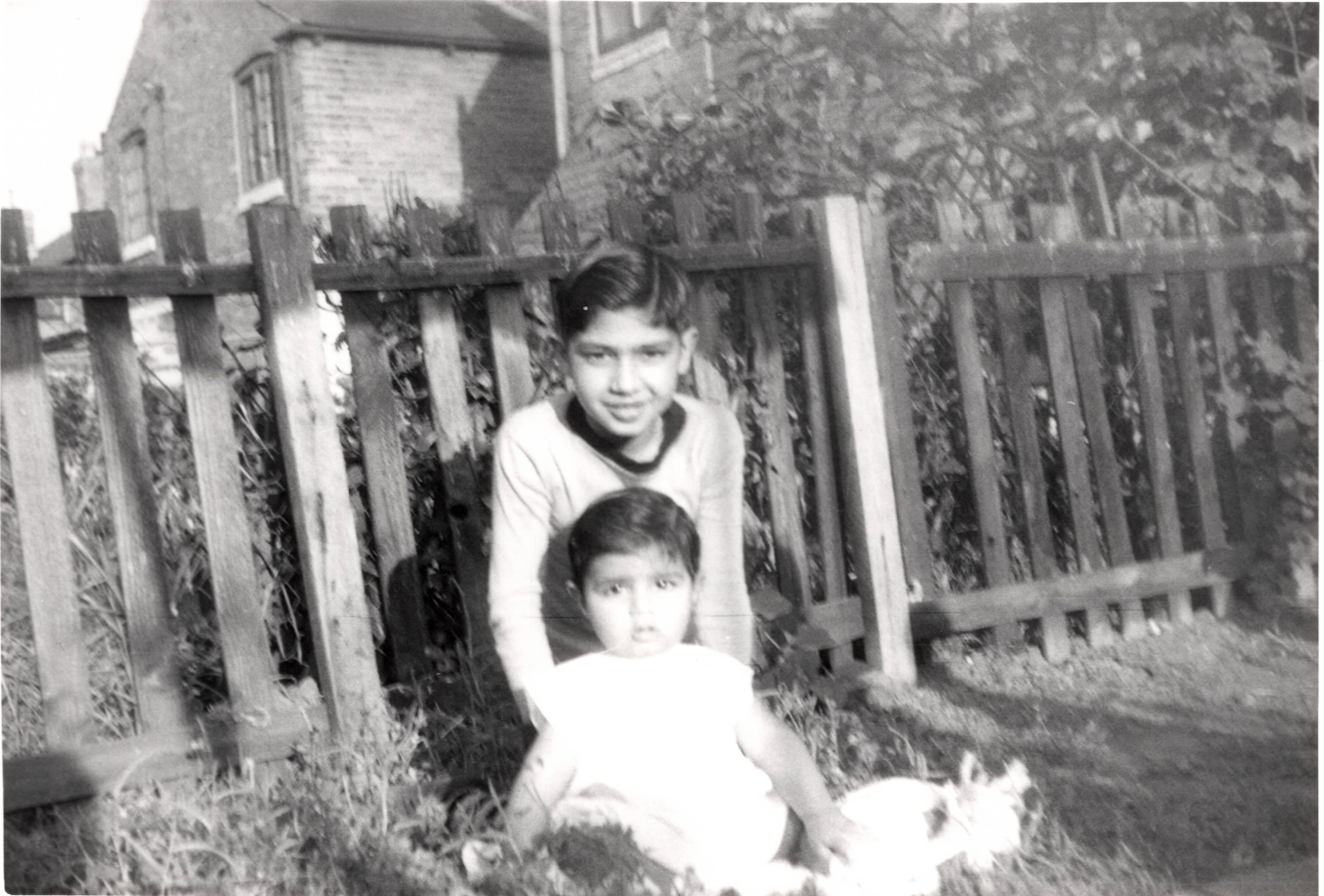Two children pose for a photograph in the garden of their terraced house in Normanton, Derby.