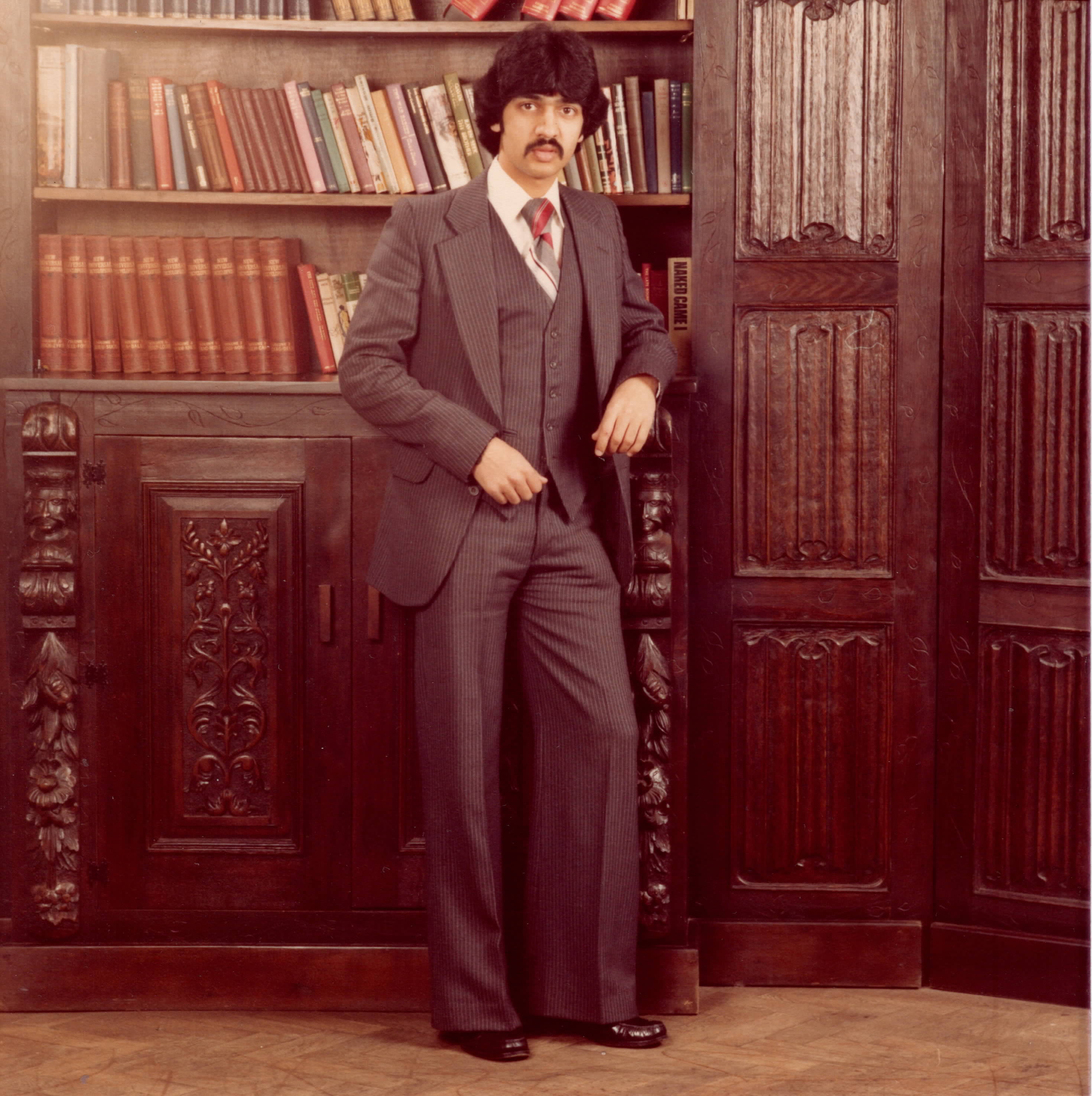 A man poses in a suit against some library shelves in W.W.Winters Studios in Derby.