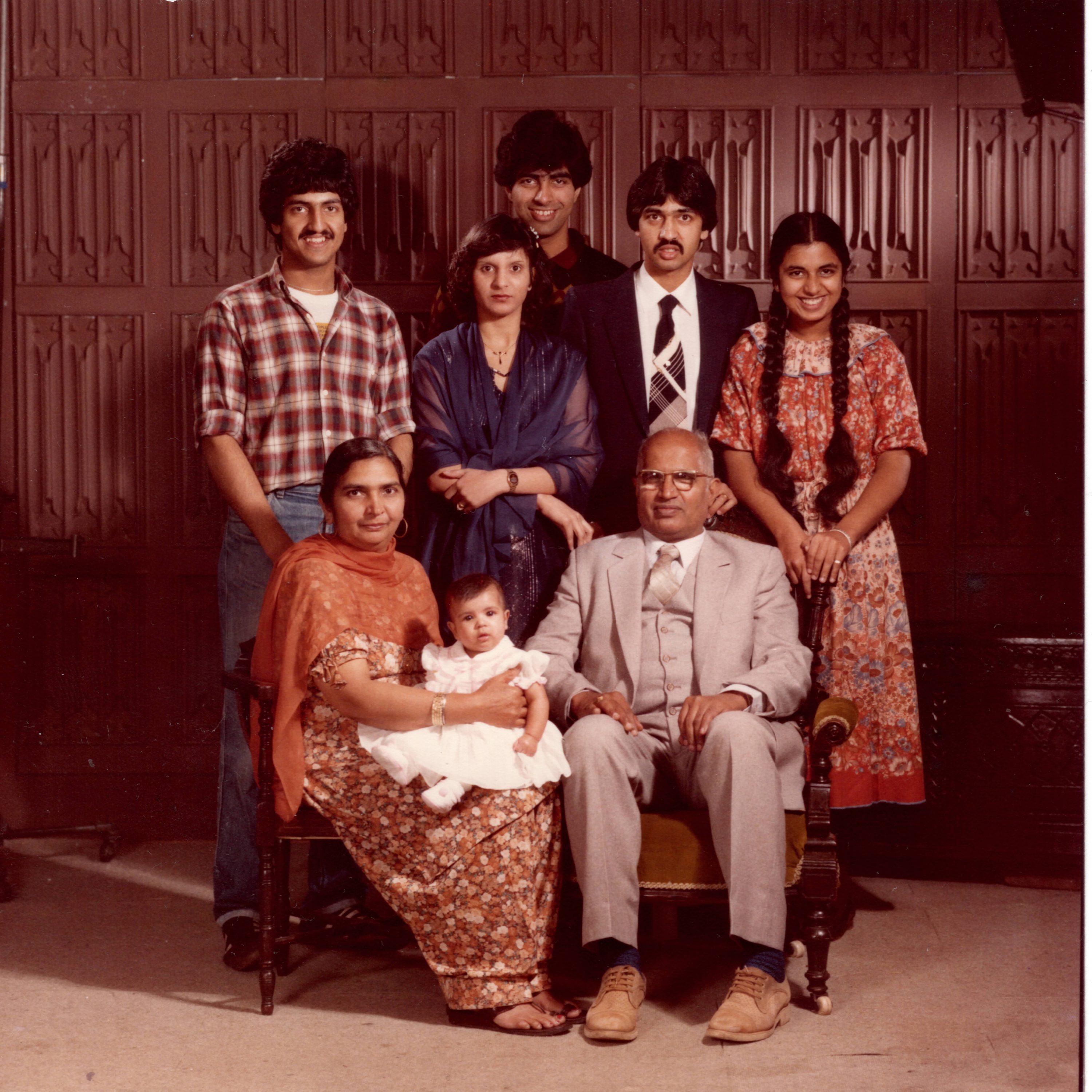 A family pose against wood panelling for a portrait at W.W.Winters studio in Derby.