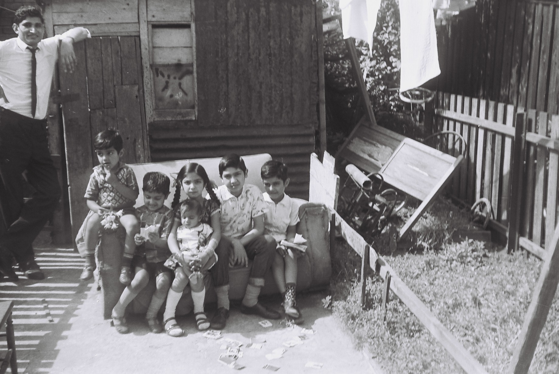A man and a group of children pose for a photo in the garden of a terraced house in Normanton Derby.
