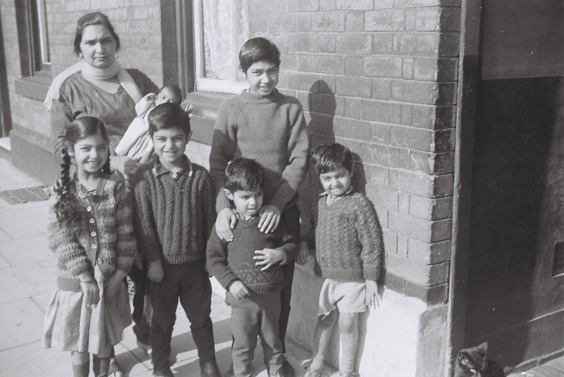 A family pose for a photo in front of their terraced house in Normanton, Derby.