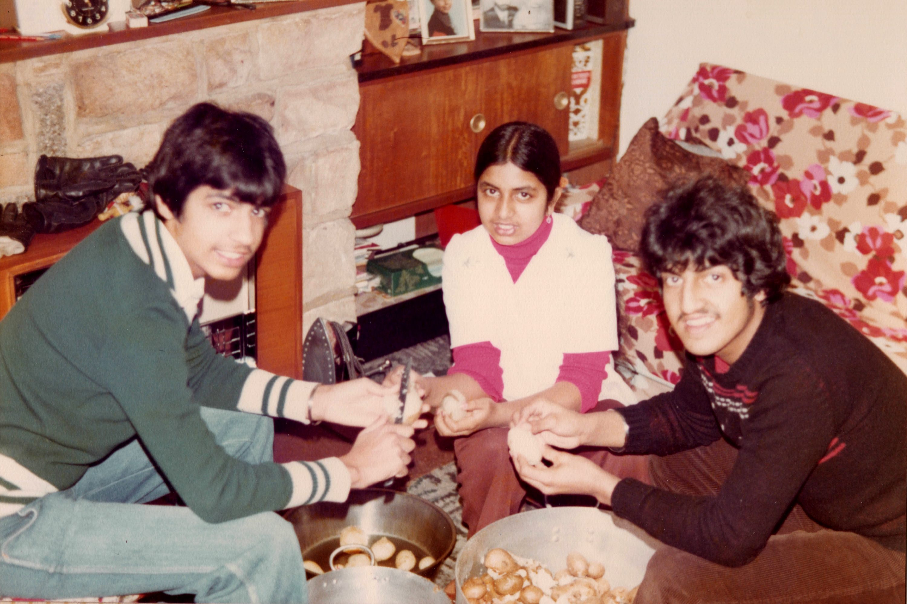 A family helps to cut onions in a home in Derby in preparation of a wedding.