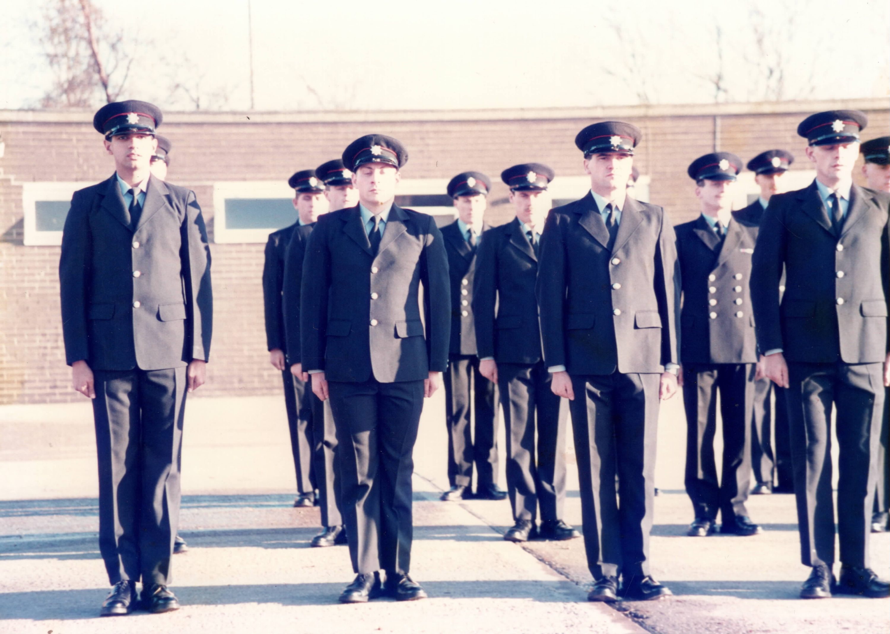 Recruits stand for the Passing out Parade, congratulating new officers on completing their initial training. Taken at Kingsway Fire Station.