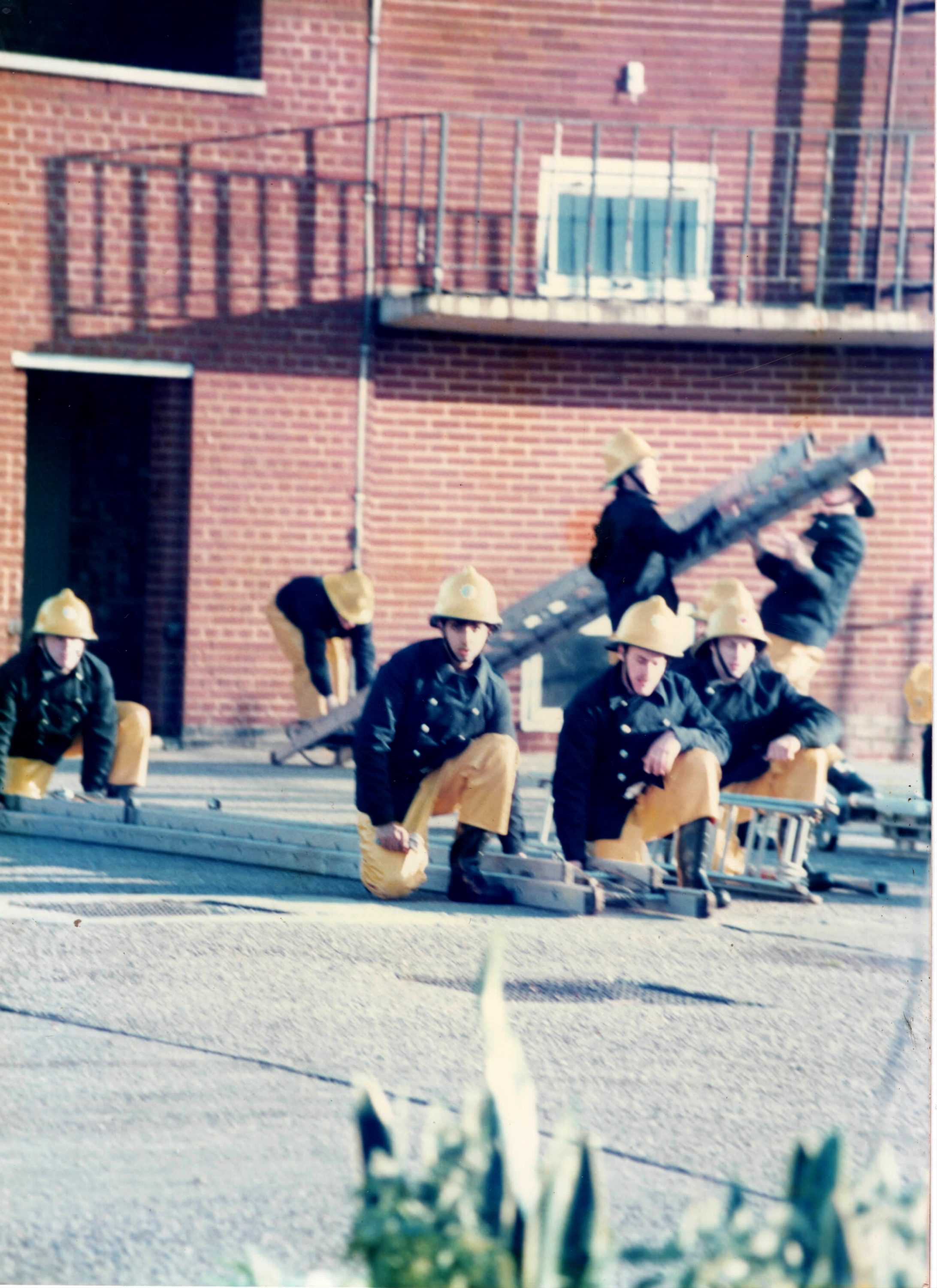Newly trained firemen ready themselves for a routine practice as part of the Passing Out Parade. Taken in Kingsway, Derby.