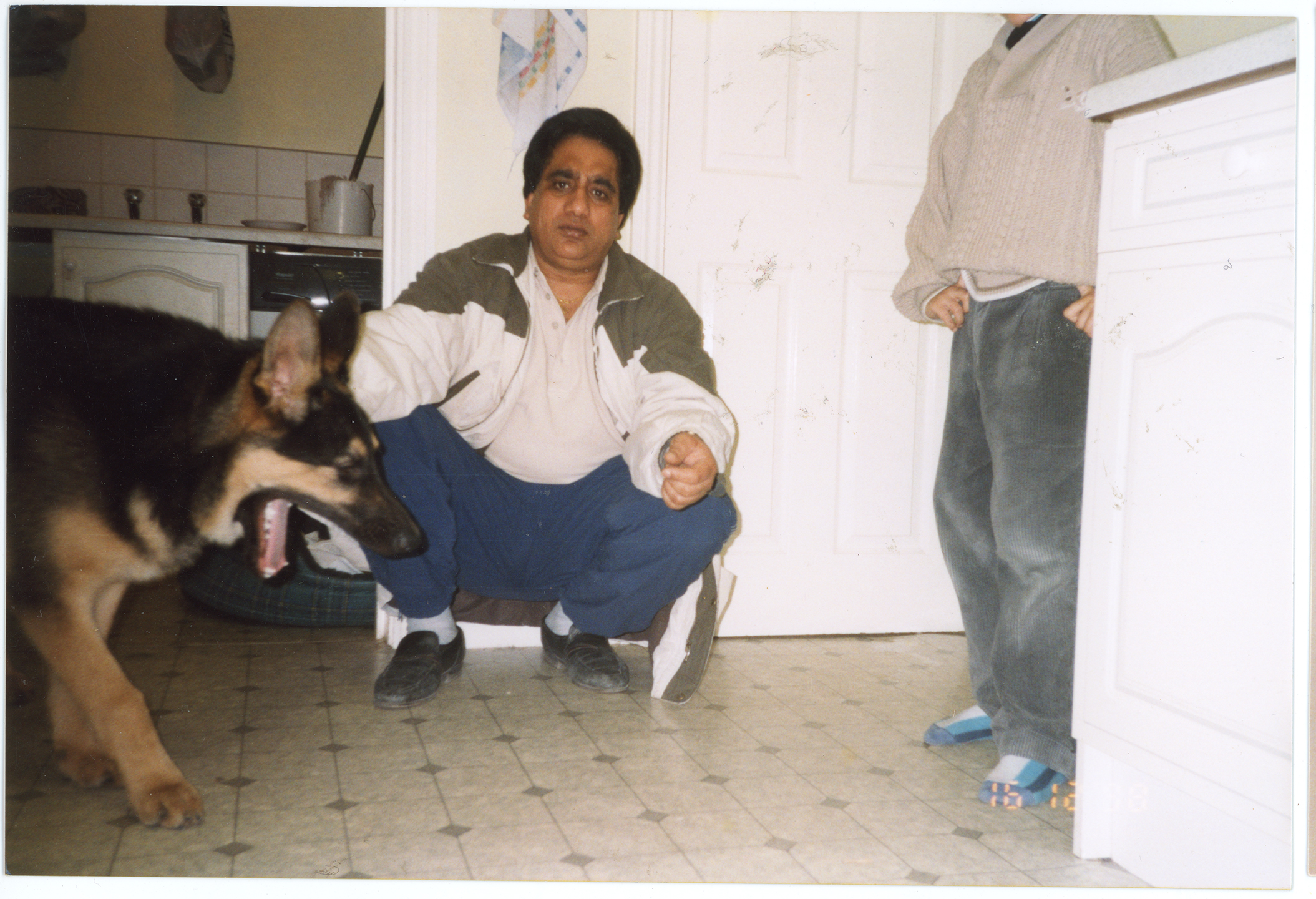 A man crouches on a kitchen floor, with another man stood at the side of him (face obscured). A dog is walking into the shot.