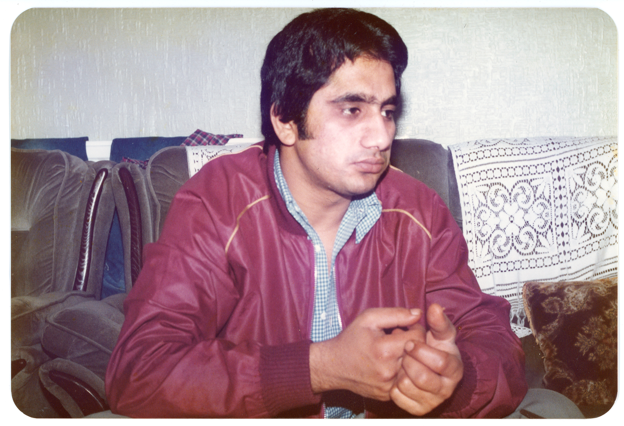A man sits forward on a sofa in a living room. Taken in Sinfin, Derby.