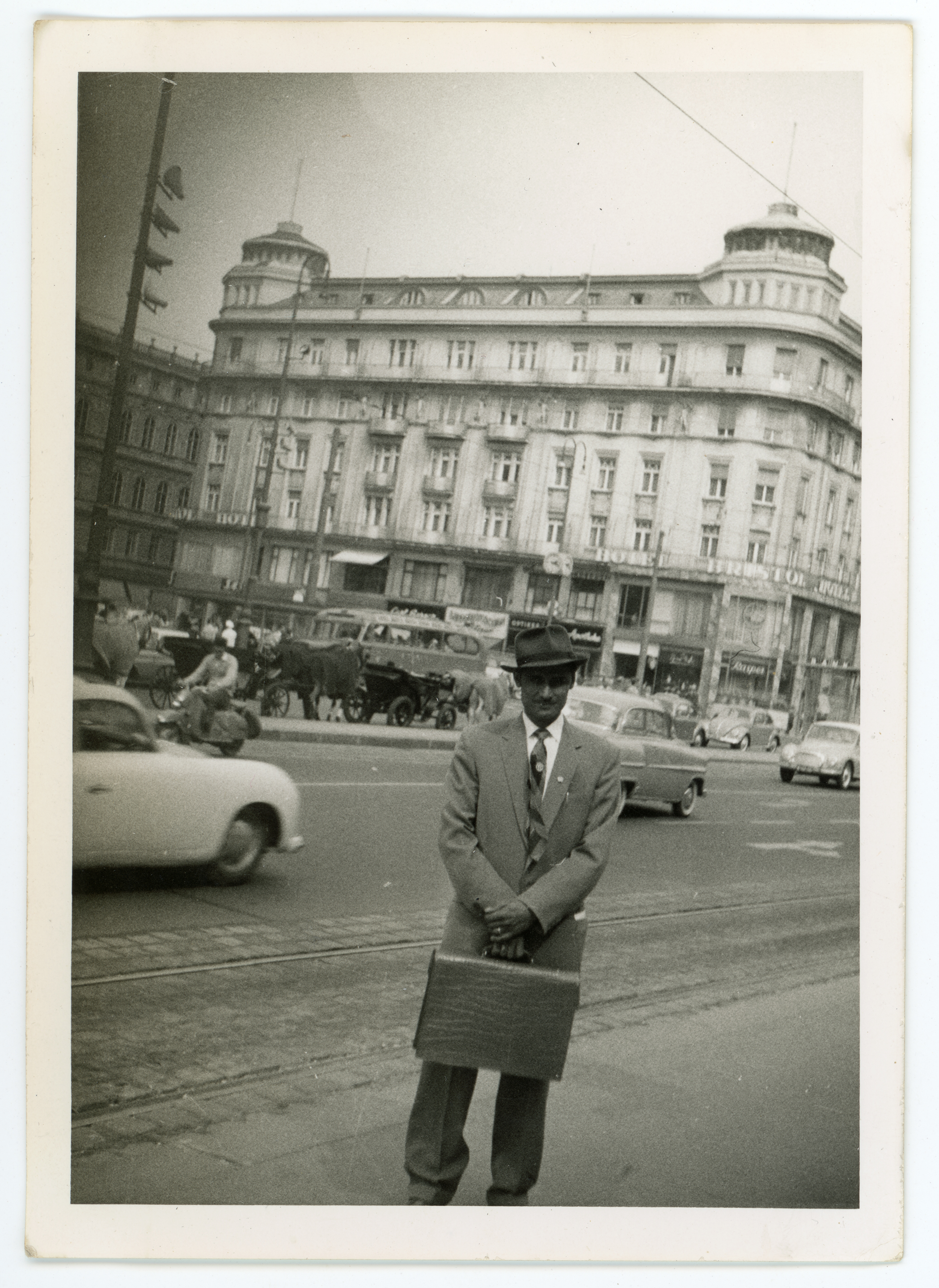 A man in a suit and hat poses with a briefcase in a city square. Large buildings make up the backdrop, with cars driving down a main road in the middleground.