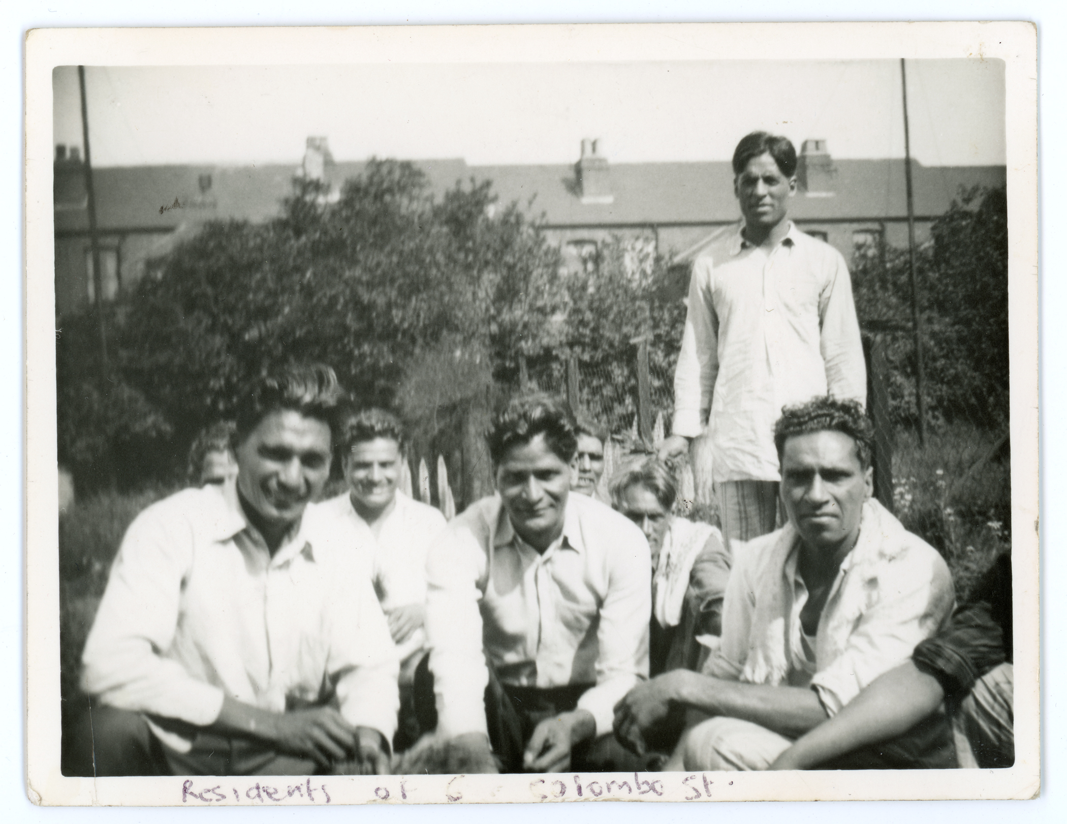 A group of 9 people pose in a garden. Three are obscured, the others are viewable and are standing or kneeling. Victorian terraced houses can be seen in the background. The words 'Residents of 6 Colombo street' is written on the print at the bottom.