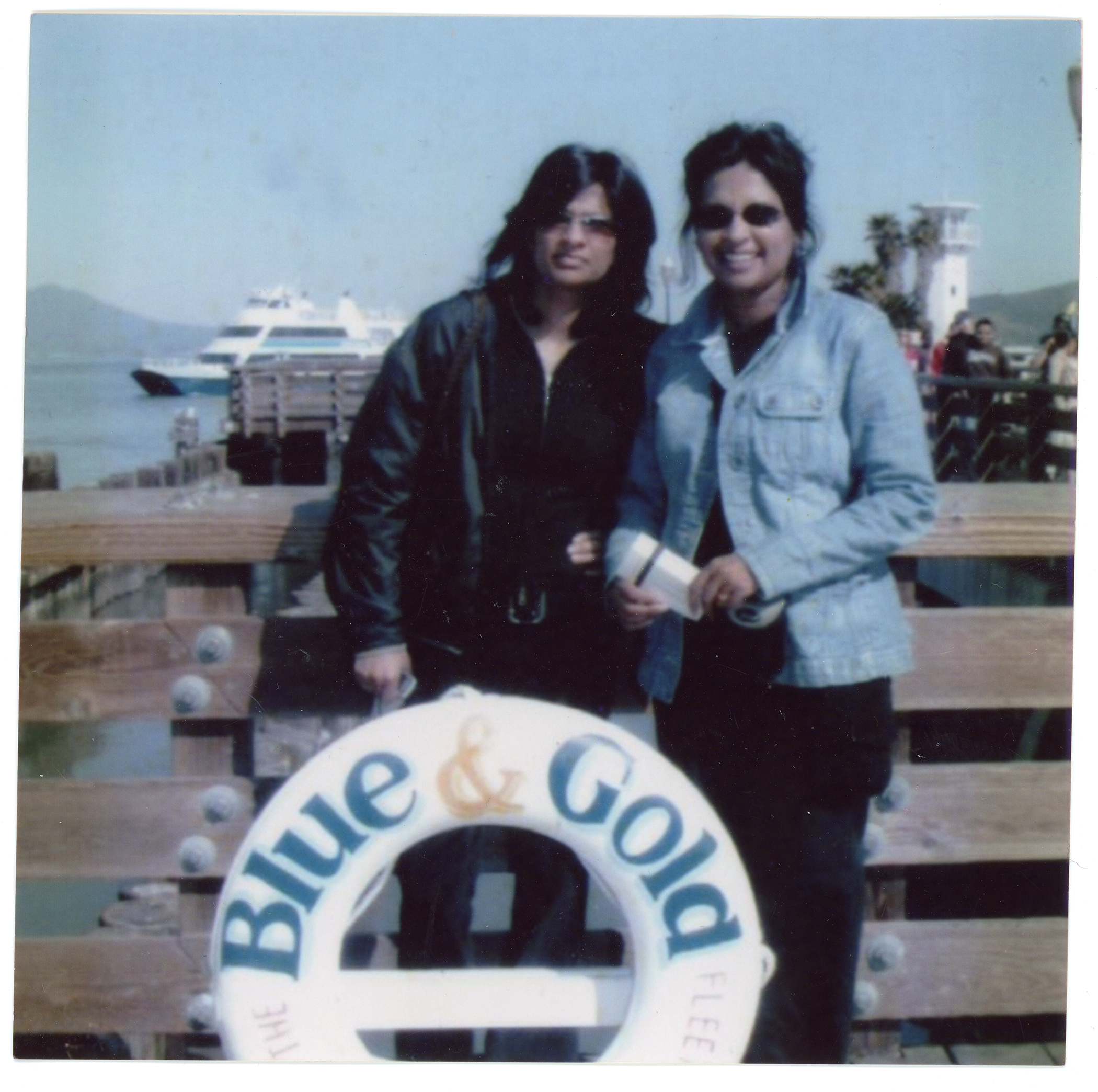 Two people pose on a sunny day in front of a water life ring that is branded 'blue and gold'. A large ship is in the background. The location is unknown.