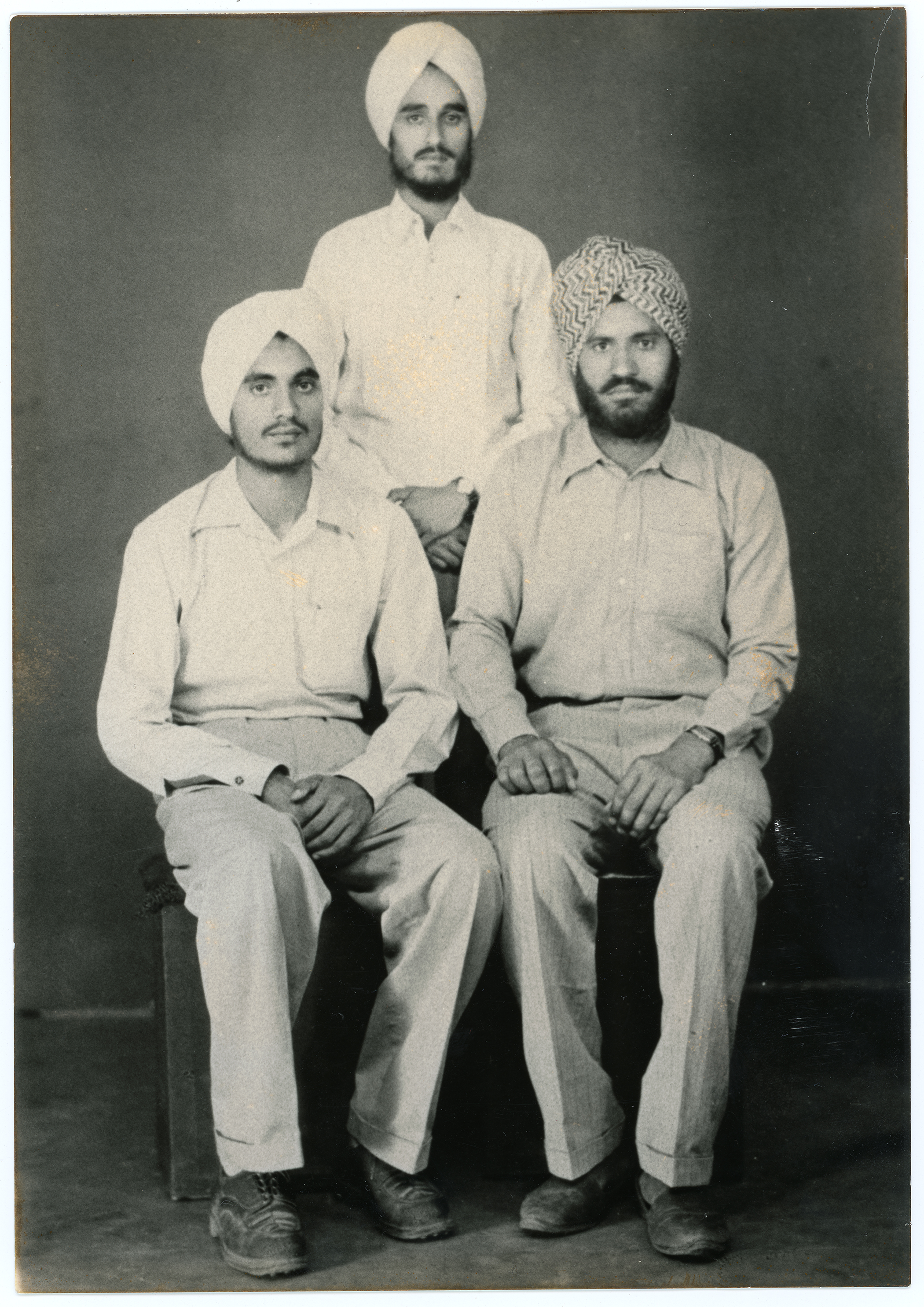 Three men in white clothes and turbans sit for a portrait in west Bengal.
