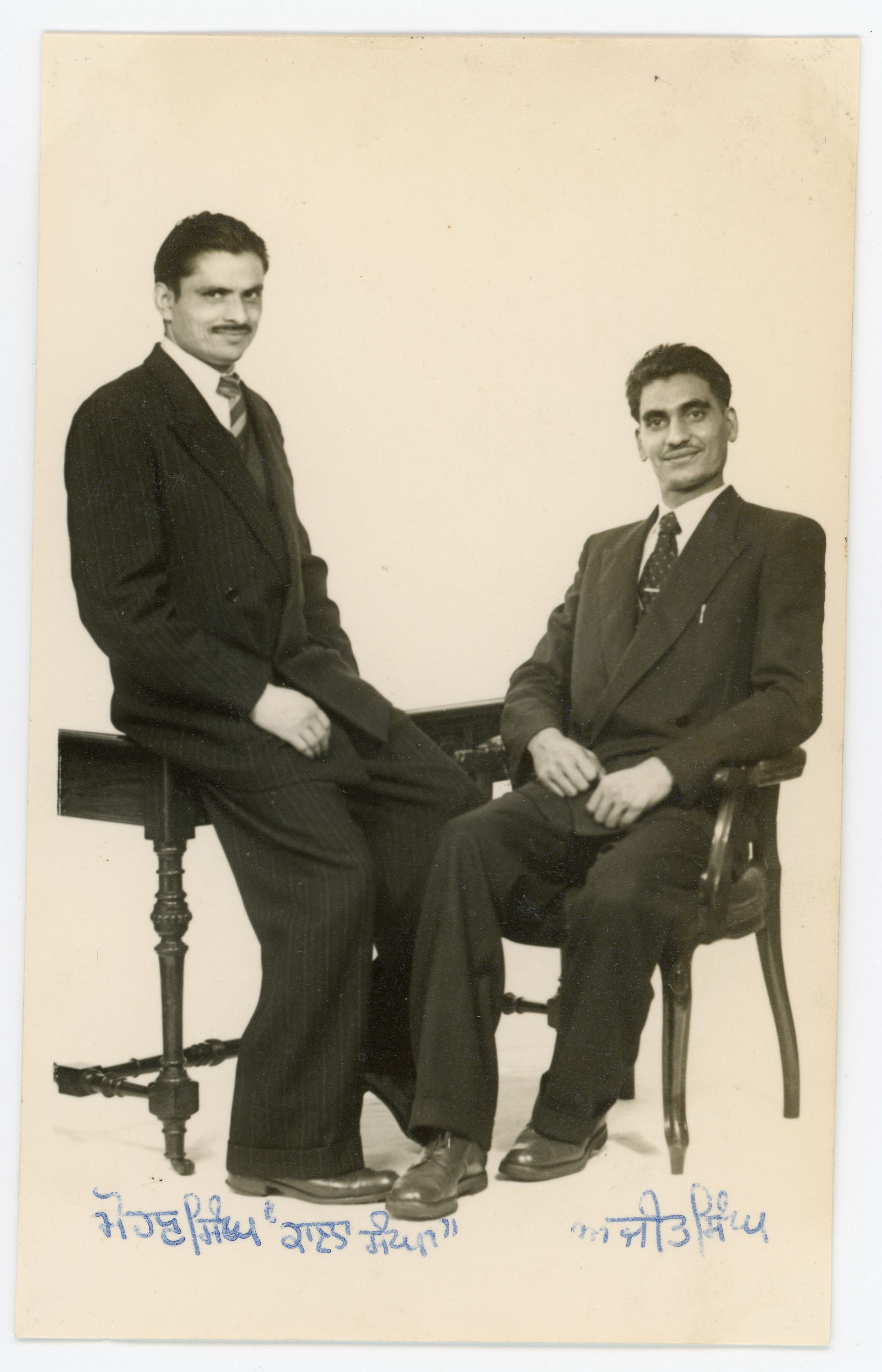 Two men pose in suits for a portrait at W.W.Winters studio in Derby. One sits on a side table, the other sits on a chair. The studio still has the furniture on site.
