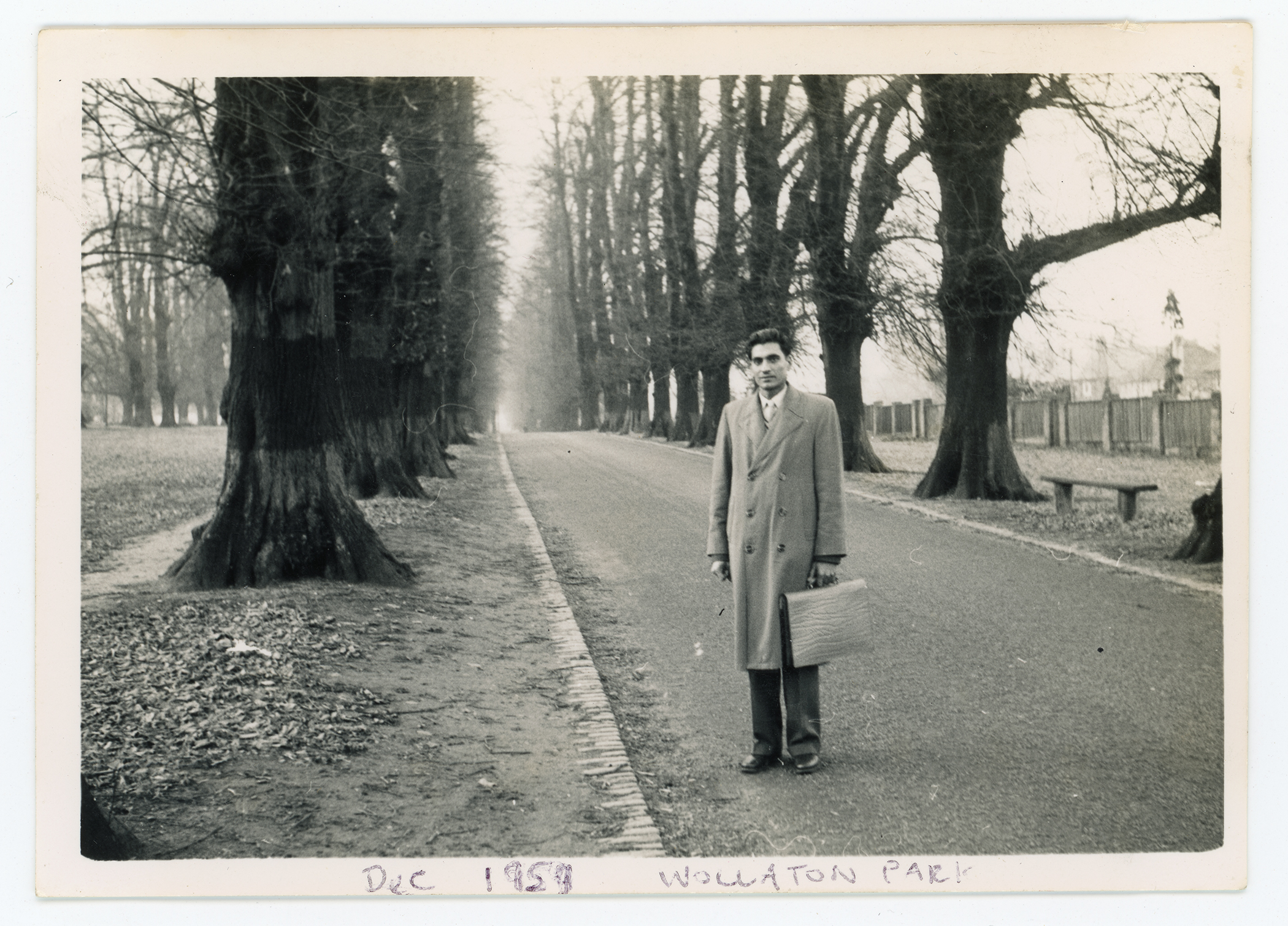 A man in a suit with a briefcase poses in a tree lined avenue at Wollaton Park, Nottingham.