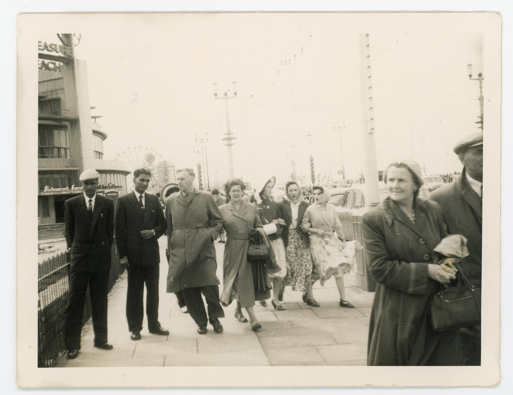 Two men in suits pose on a busy promenade as people walk by. A sign for pleasure beach in Blackpool is in the background.