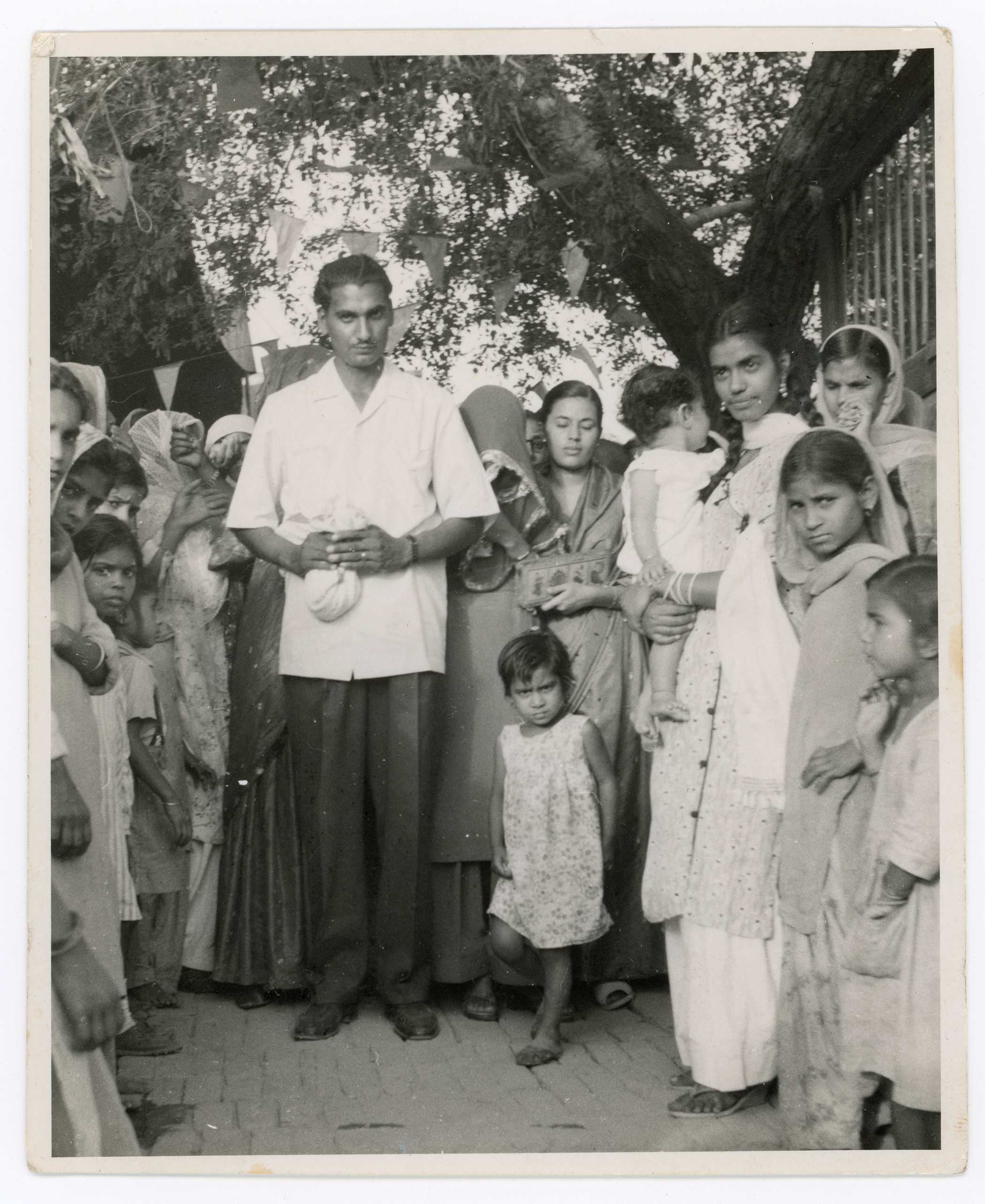 A group of people pose for a wedding photo in Mahal Village