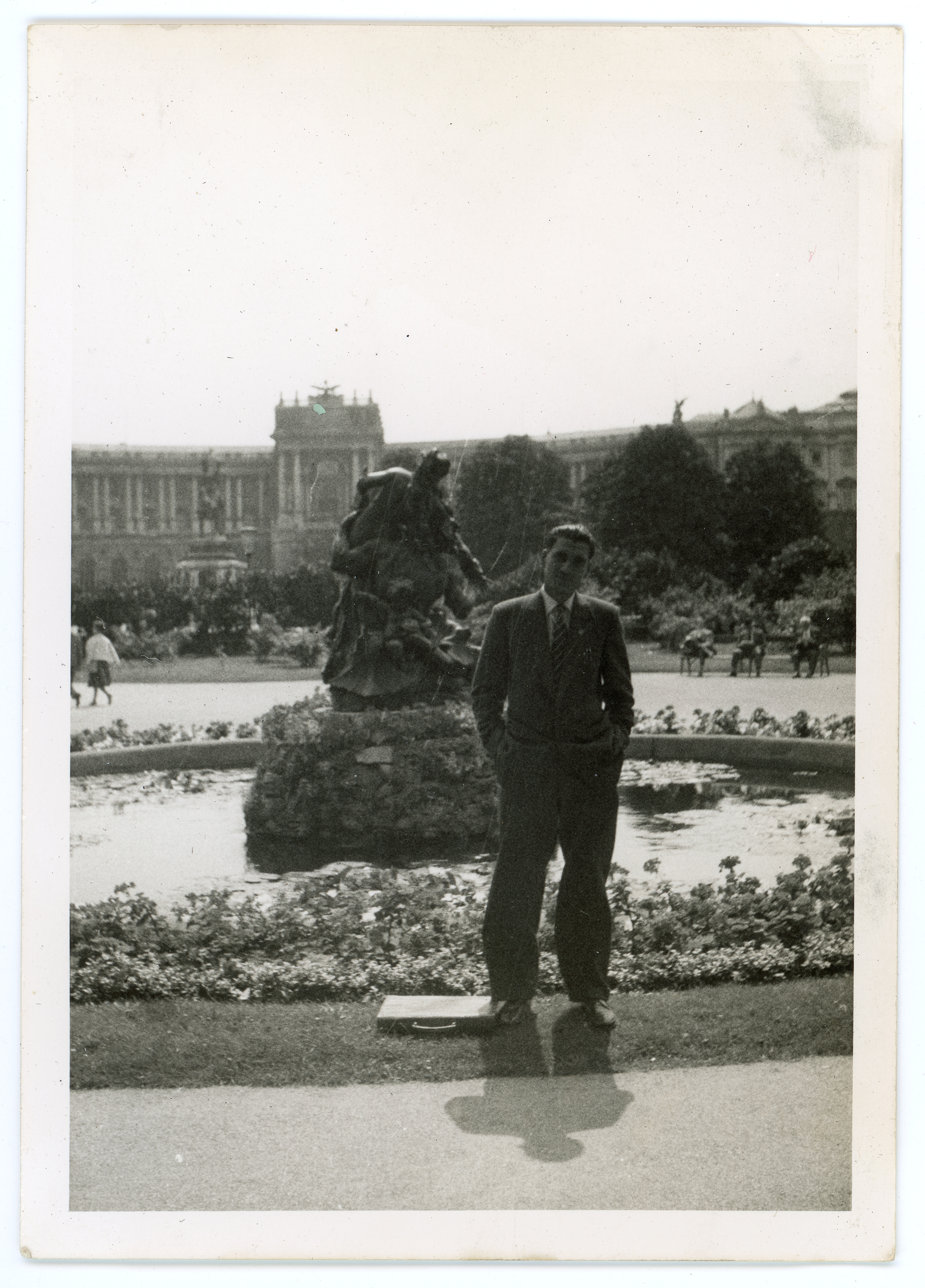 A man in a suit poses next to a fountain. A large manor house is in the background. Taken in Vienna, Austria.