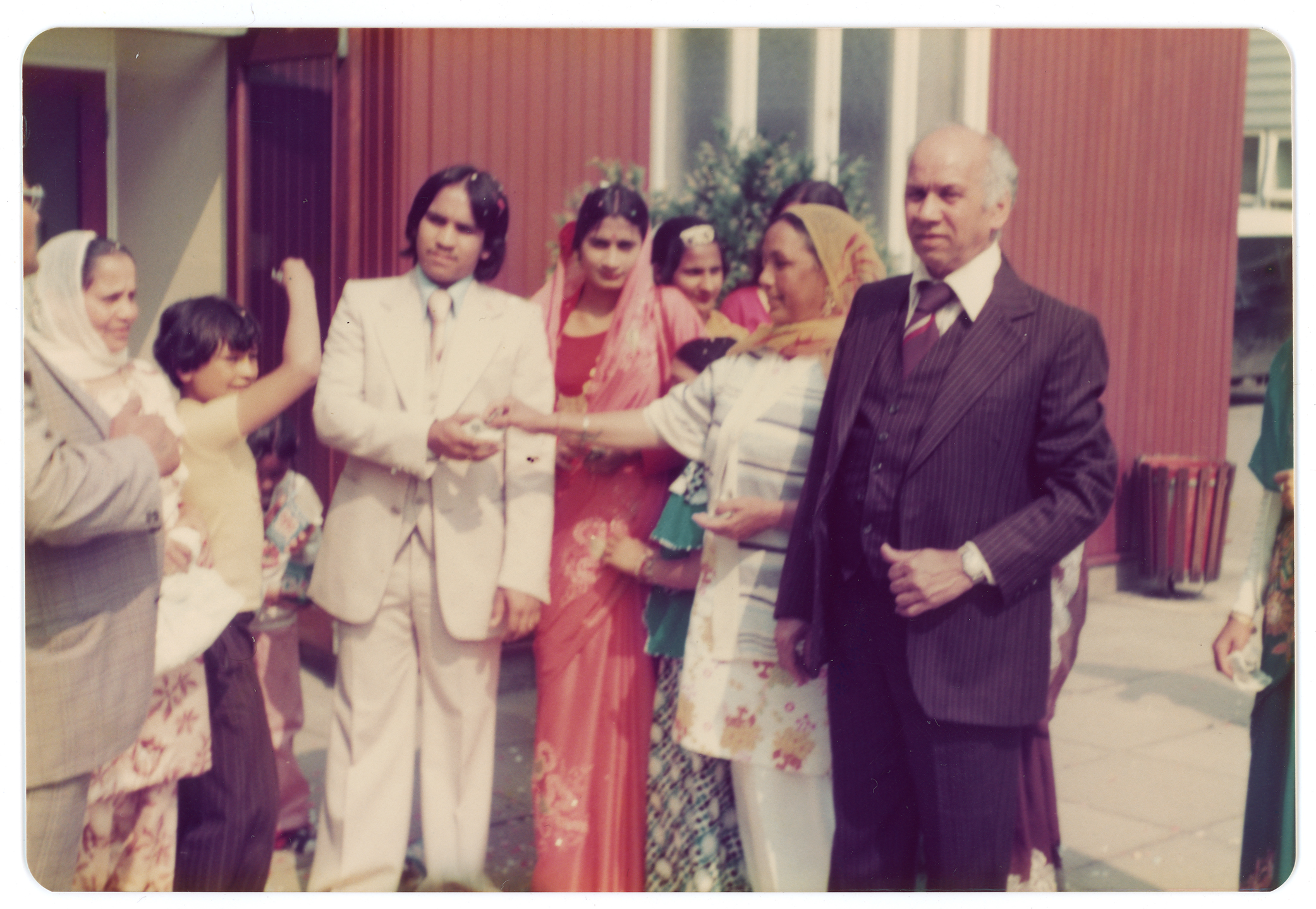 A group of family and friends gather outside after a wedding ceremony in Derby.