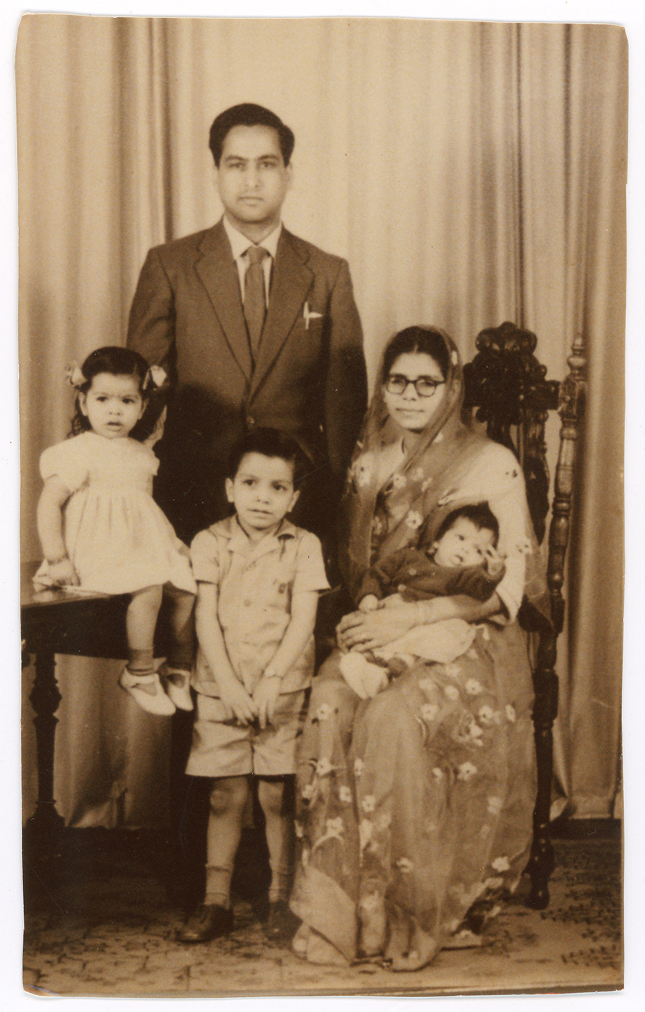 A family pose for a portrait against at plain backdrop at W.W.Winters studio in Derby.