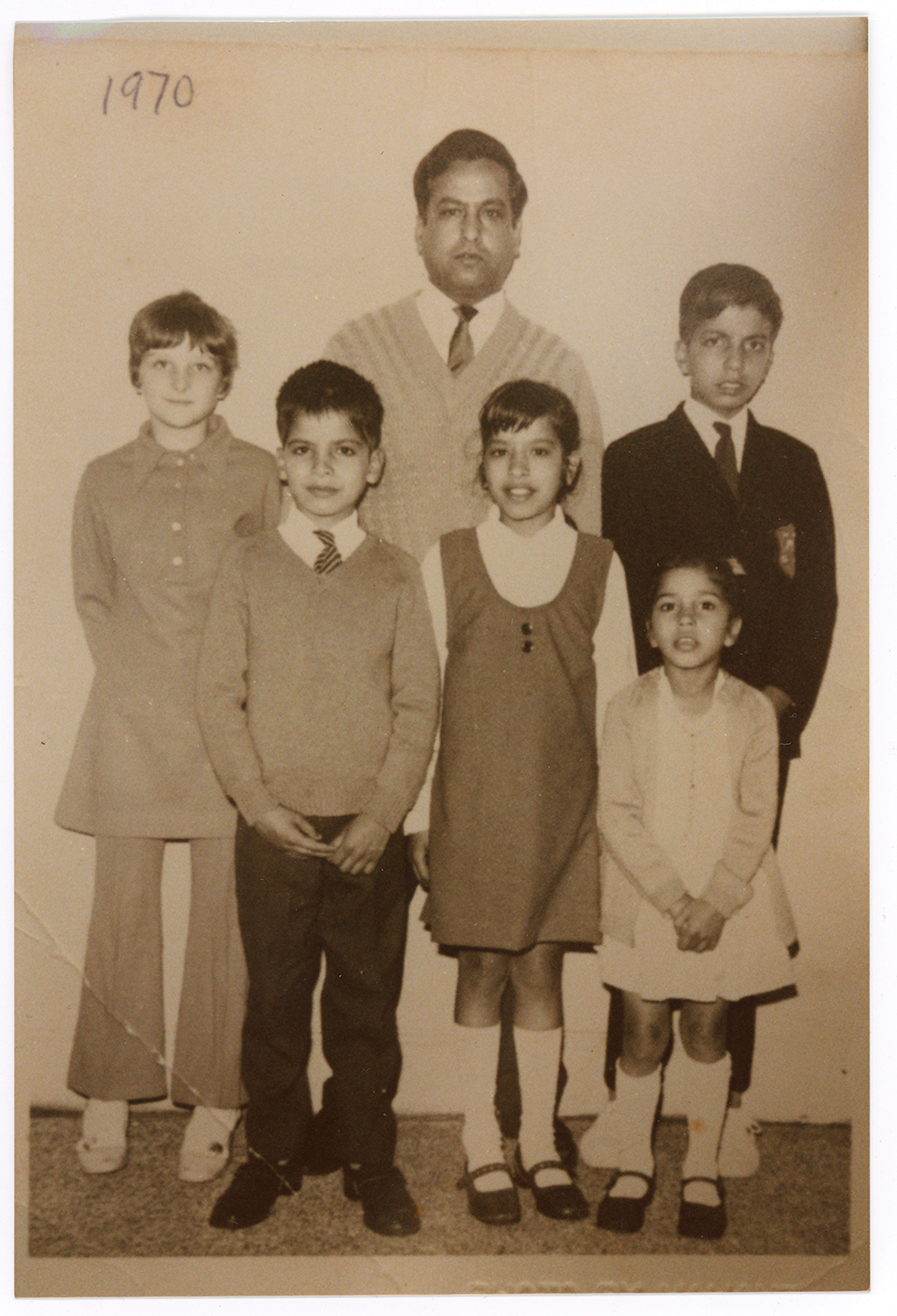 A group of family and friends pose in for a portrait in their home. It's appears like a studio portrait. Taken in Normanton Derby.