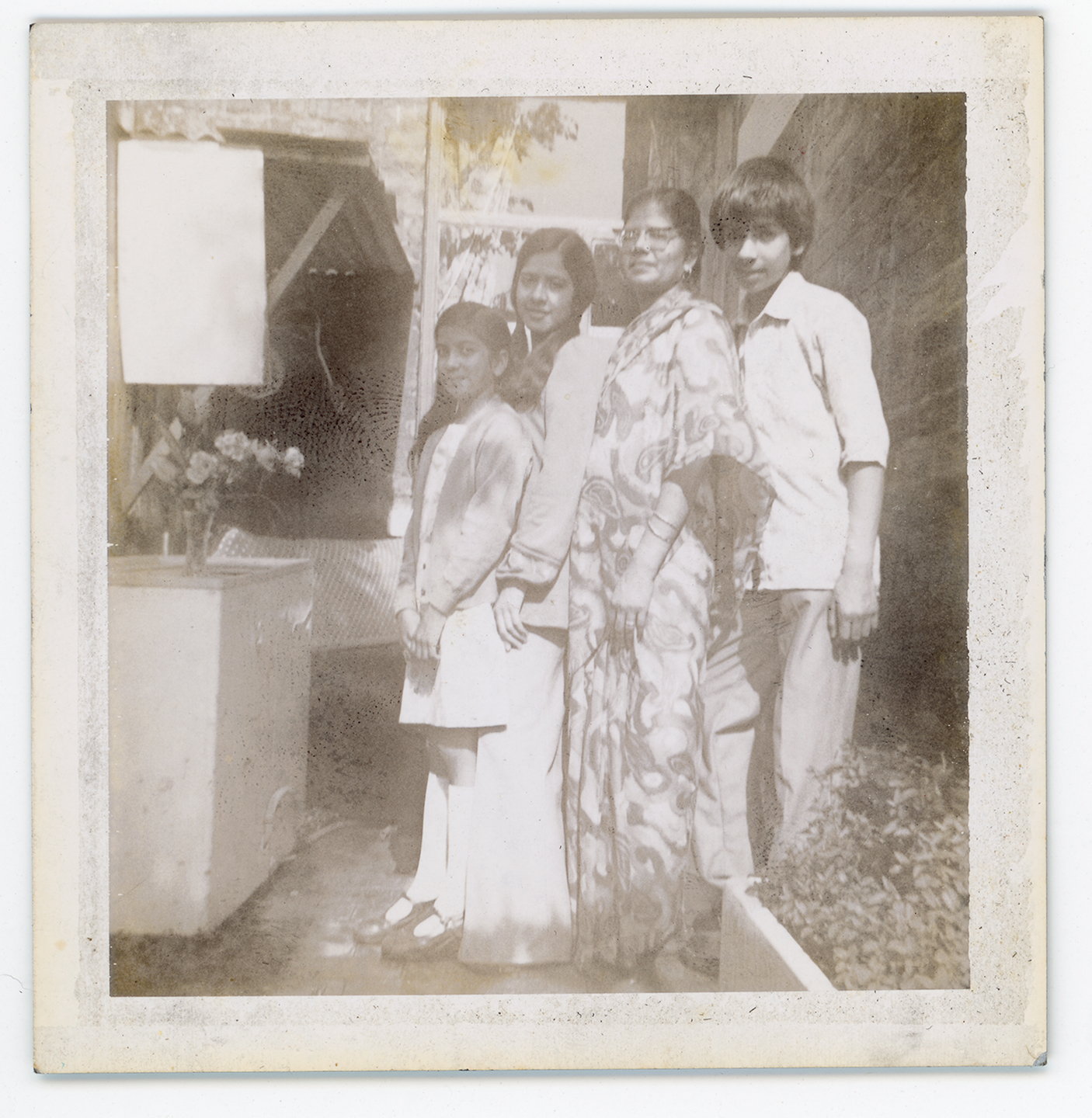 A family pose in the back garden of a Victorian terrace house in Normanton, Derby.