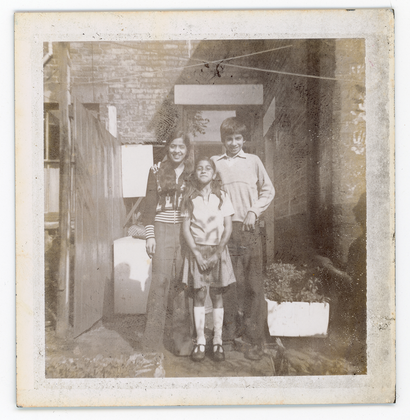 A family pose in the back garden of their Victorian terrace in Normanton, Derby.