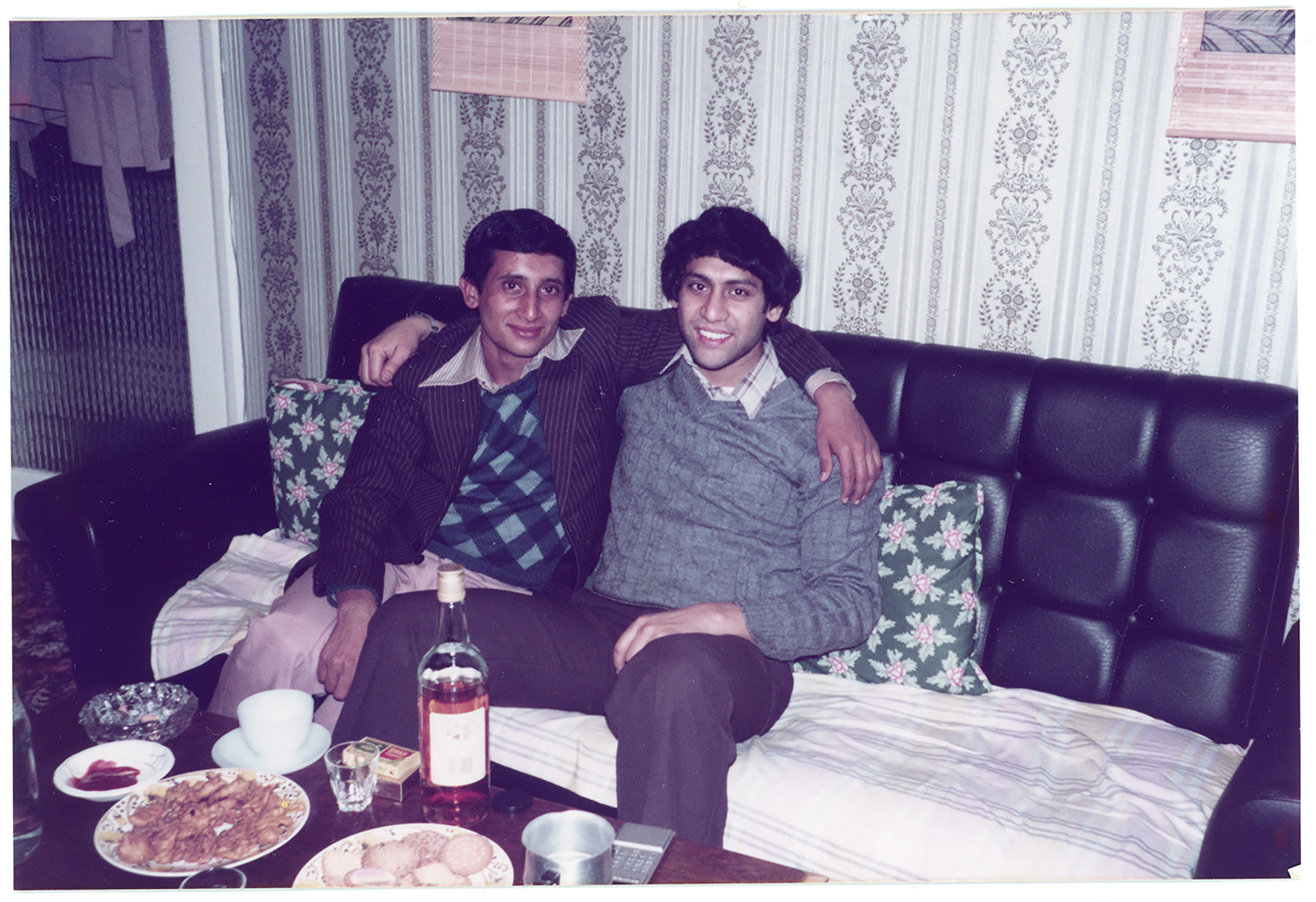 Two men pose for a photo on a sofa. Taken on Christmas day in a house in Normanton, Derby.