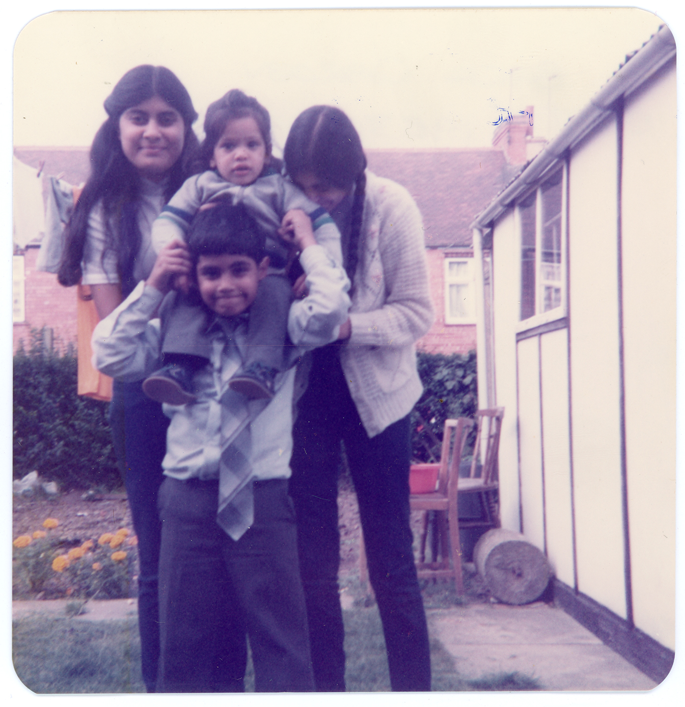 A group of young people pose in the garden of a terraced house in Derby.
