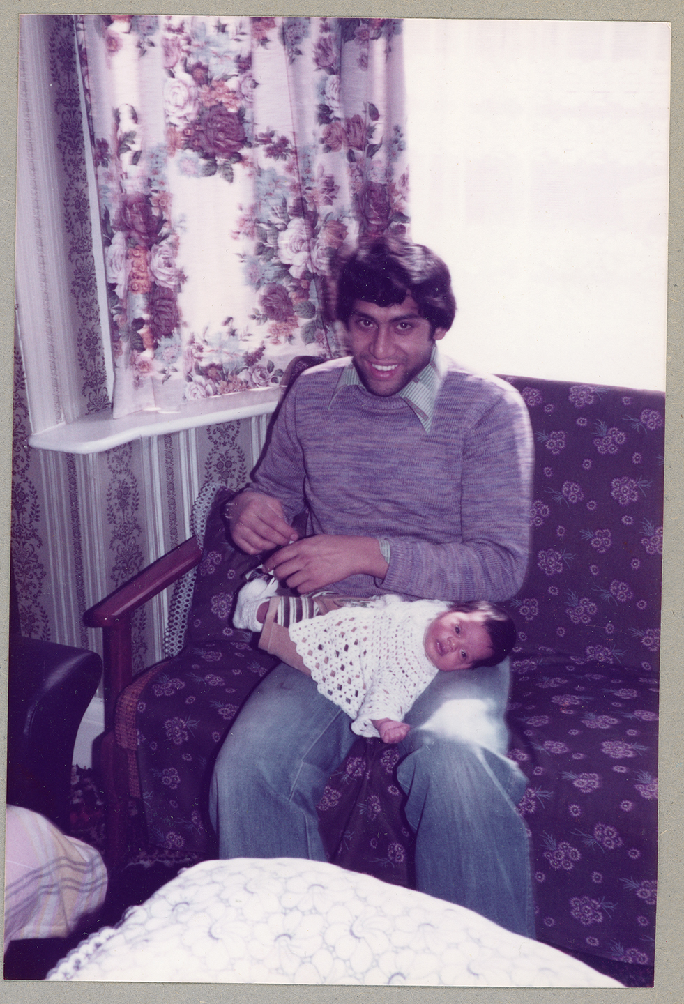 A man puts socks on a baby in their home in Derby.