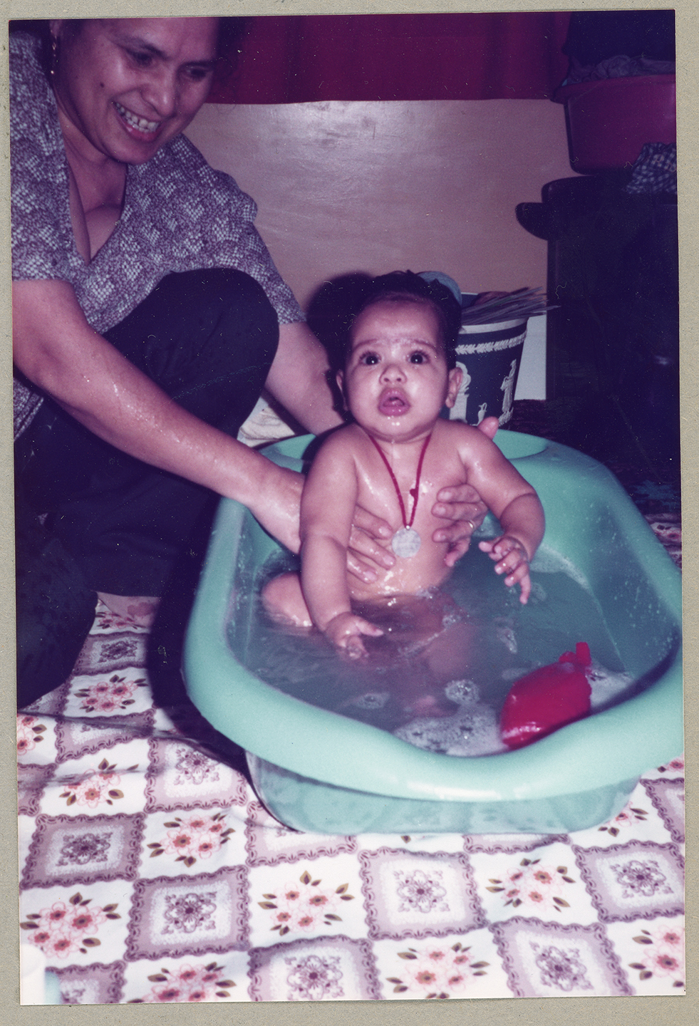 A mother baths a baby in their home in Derby.