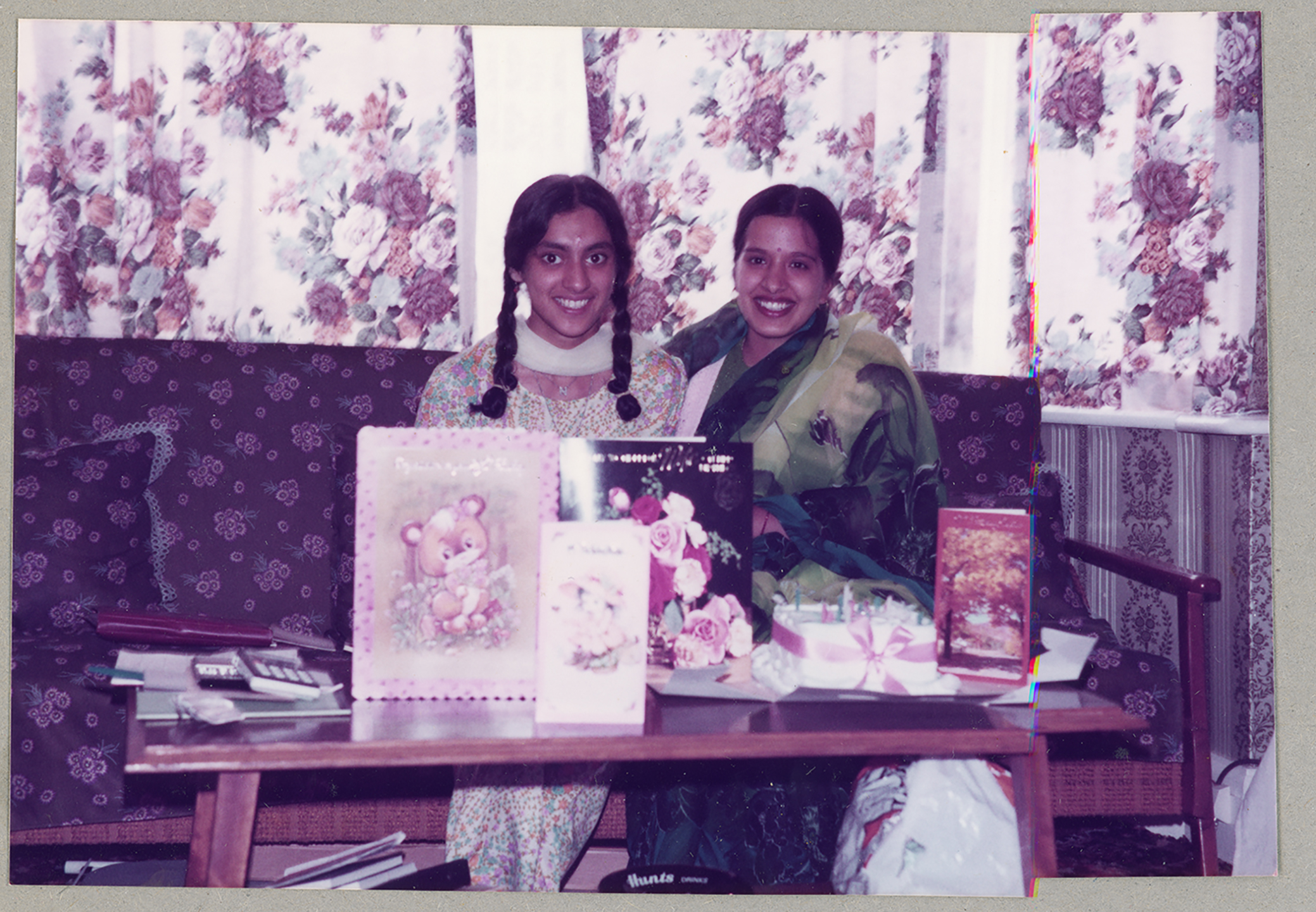 Two people pose for a photograph during celebration in a home in Derby.