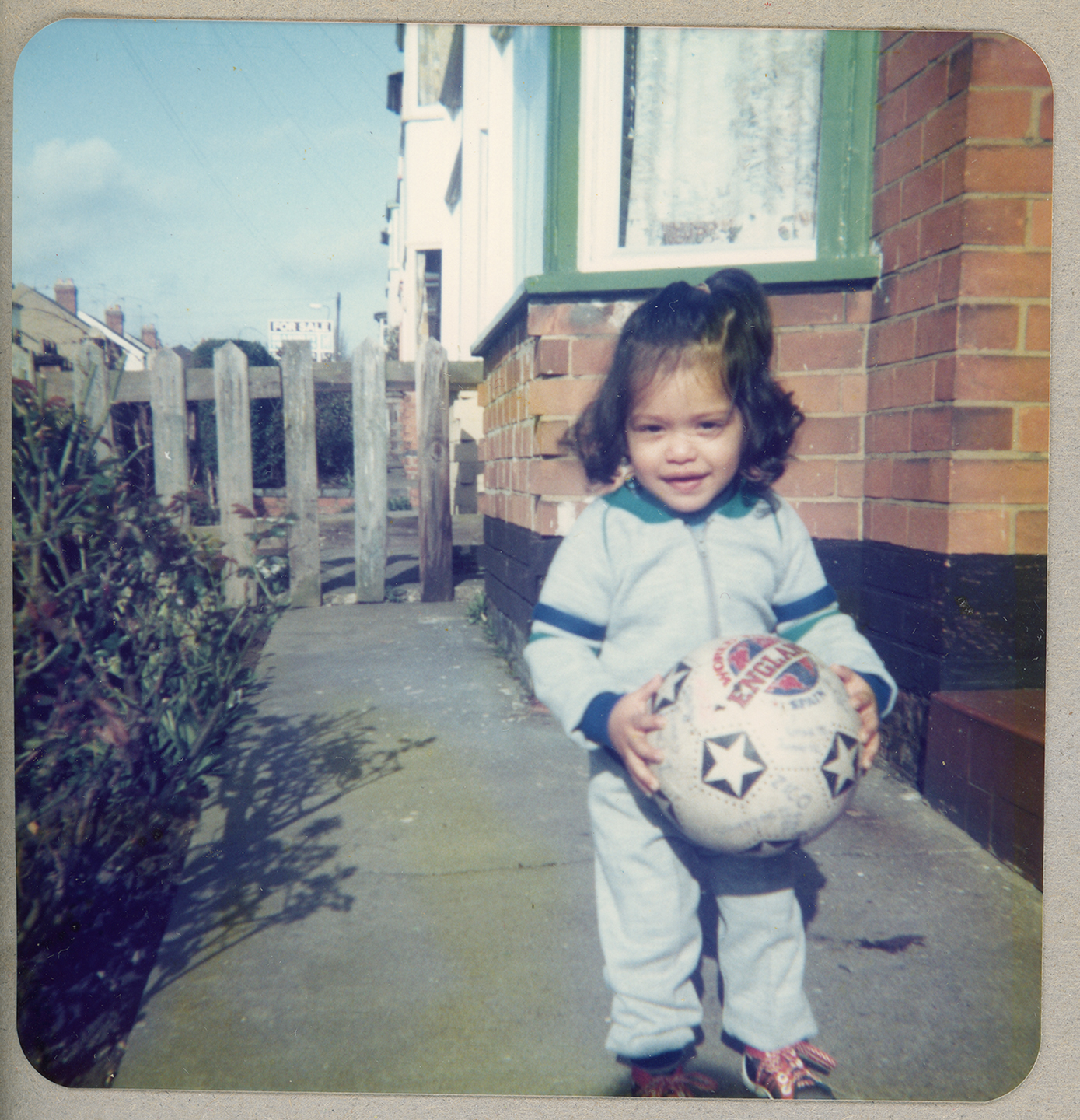 A young child stands with a ball in a front garden of a terrace in Derby.