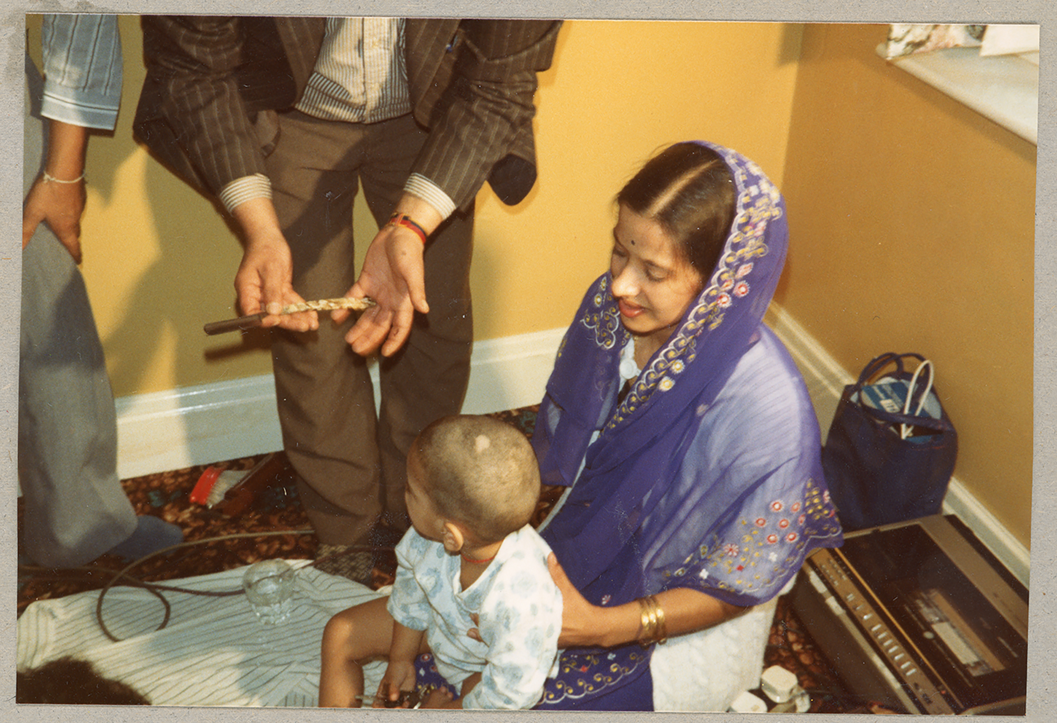 A family celebrate a baby's first haircut in a house in Derby.