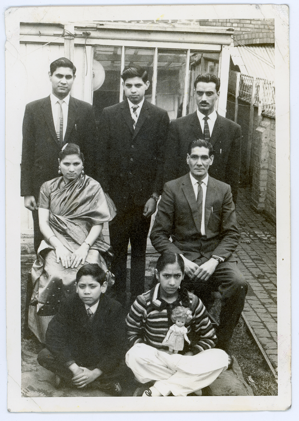 A family pose for a photograph in the garden of their terraced home in Derby.