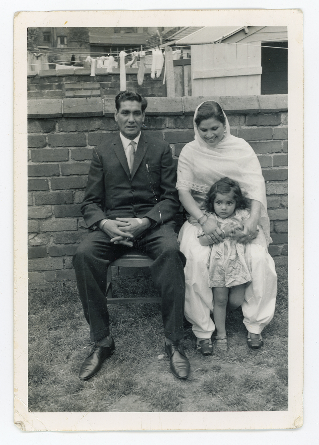 A family pose in the garden of a terrace house in Derby.