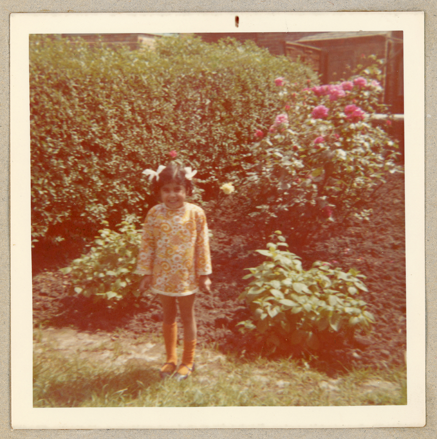 A young child poses in the garden in front of some rose bushes.