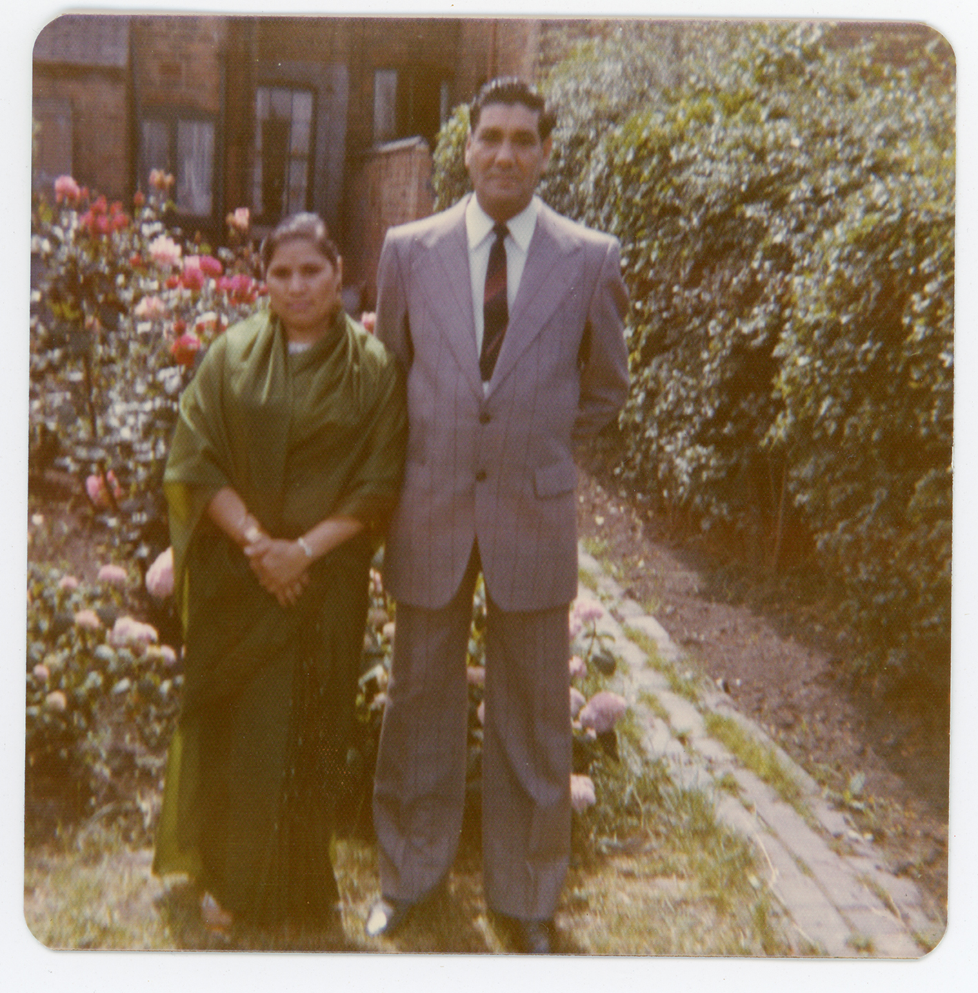 A couple pose in a garden for a photograph in Derby.