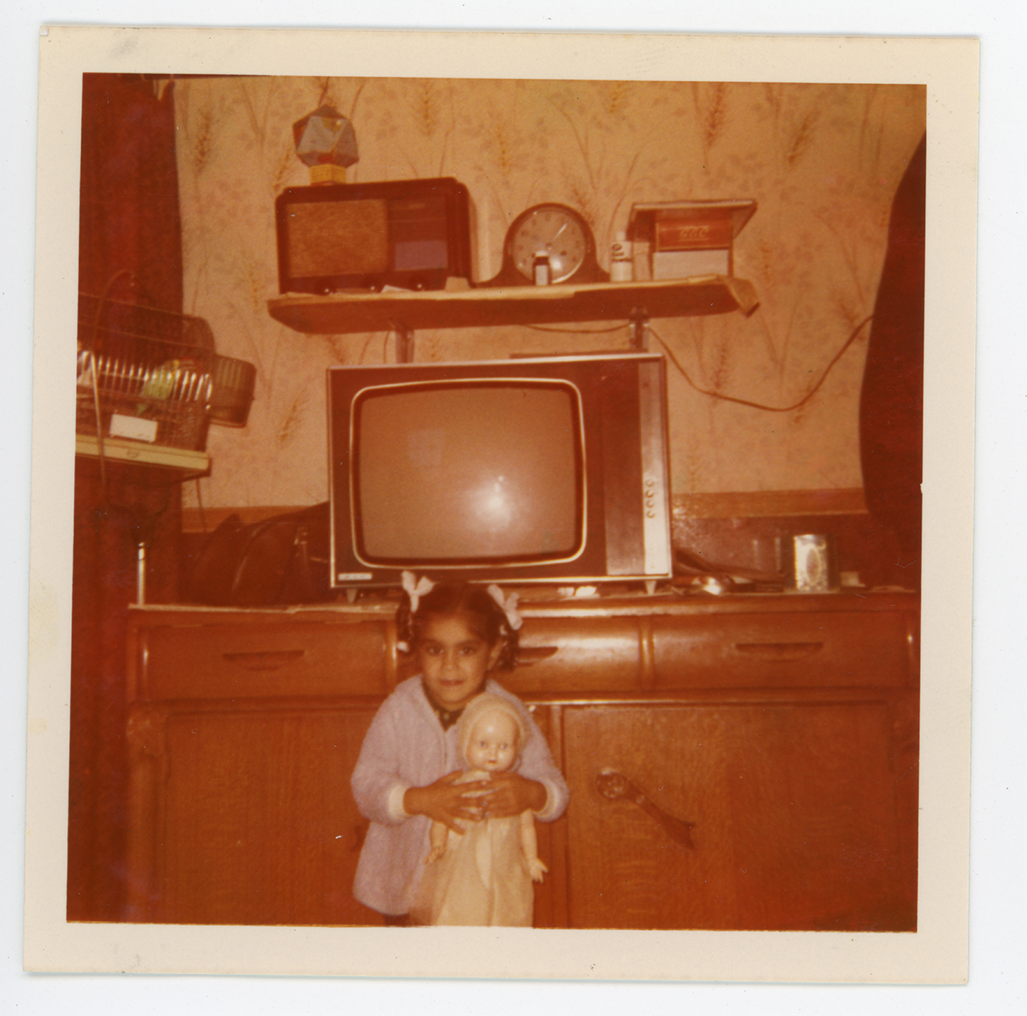 A young girl poses with a doll in front of a TV in a house in Derby.