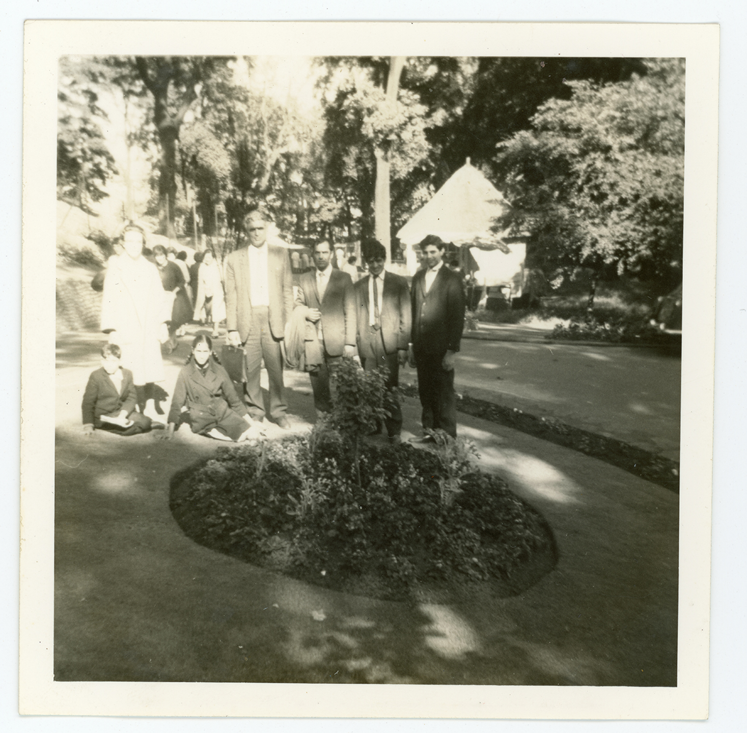 A group of people pose in the gardens of Alton Towers theme park in Derby.