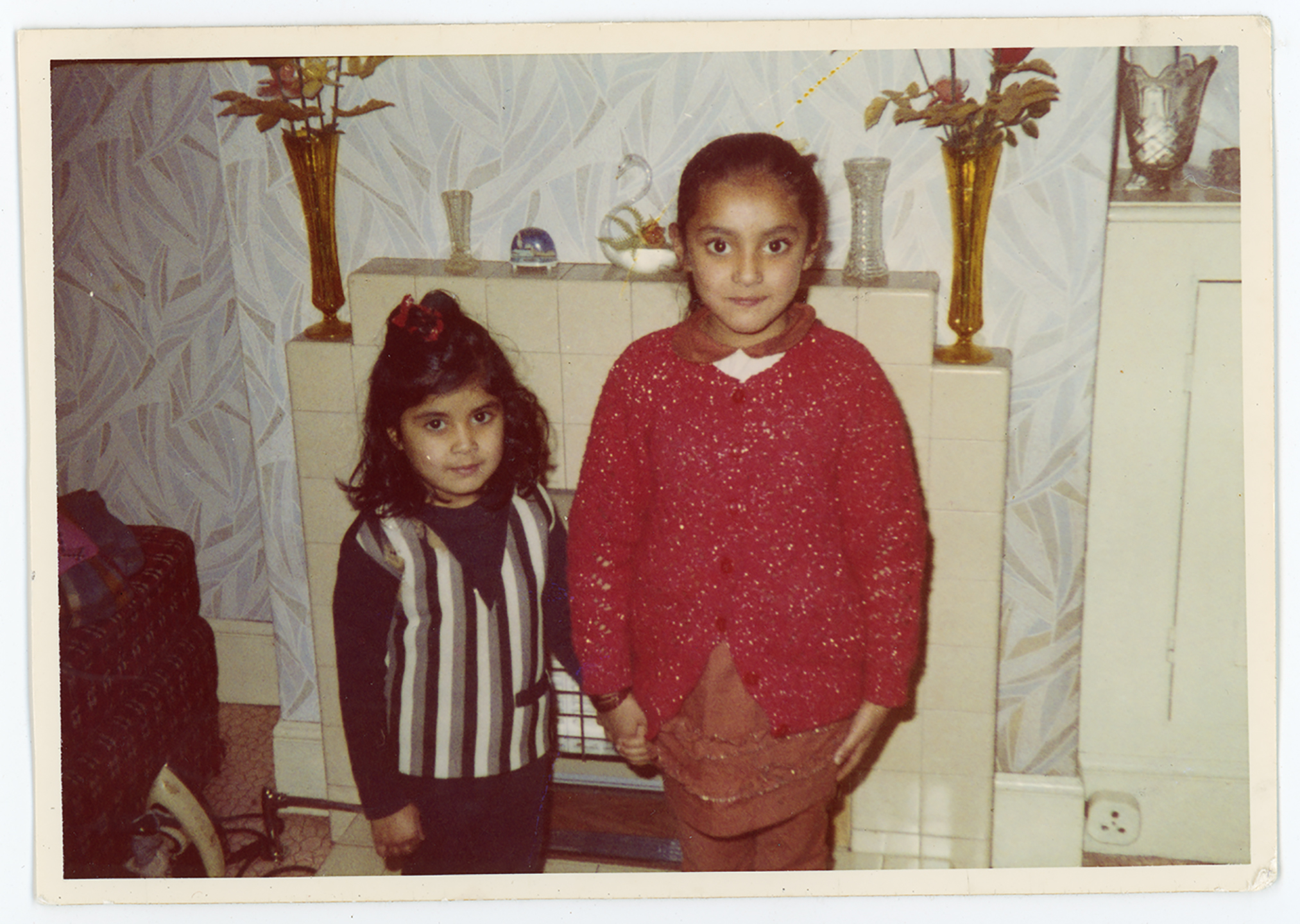 Two young people pose for a photograph in a family home in Long Eaton, Derbyshire.