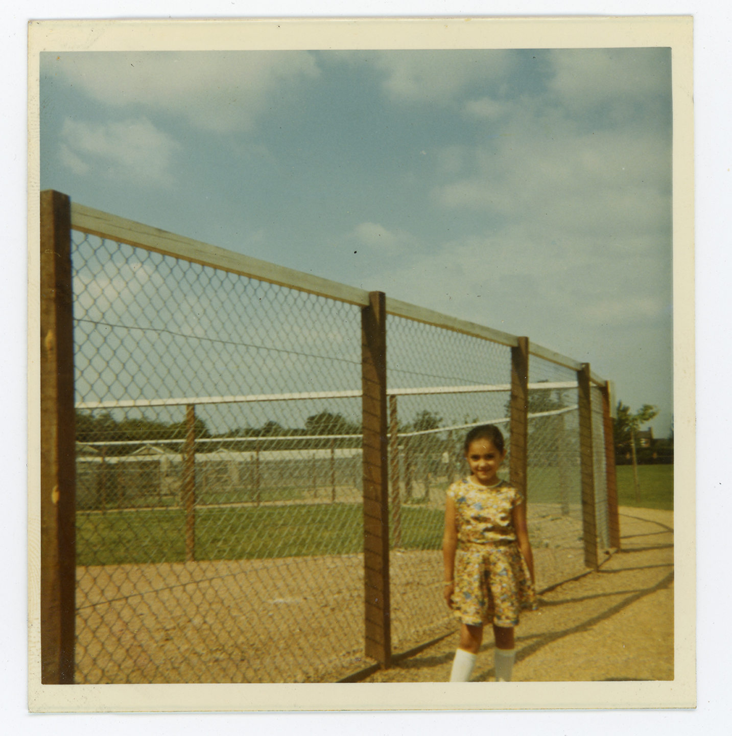 A child poses in front of an enclosure at Twycross Zoo, Derbyshire.