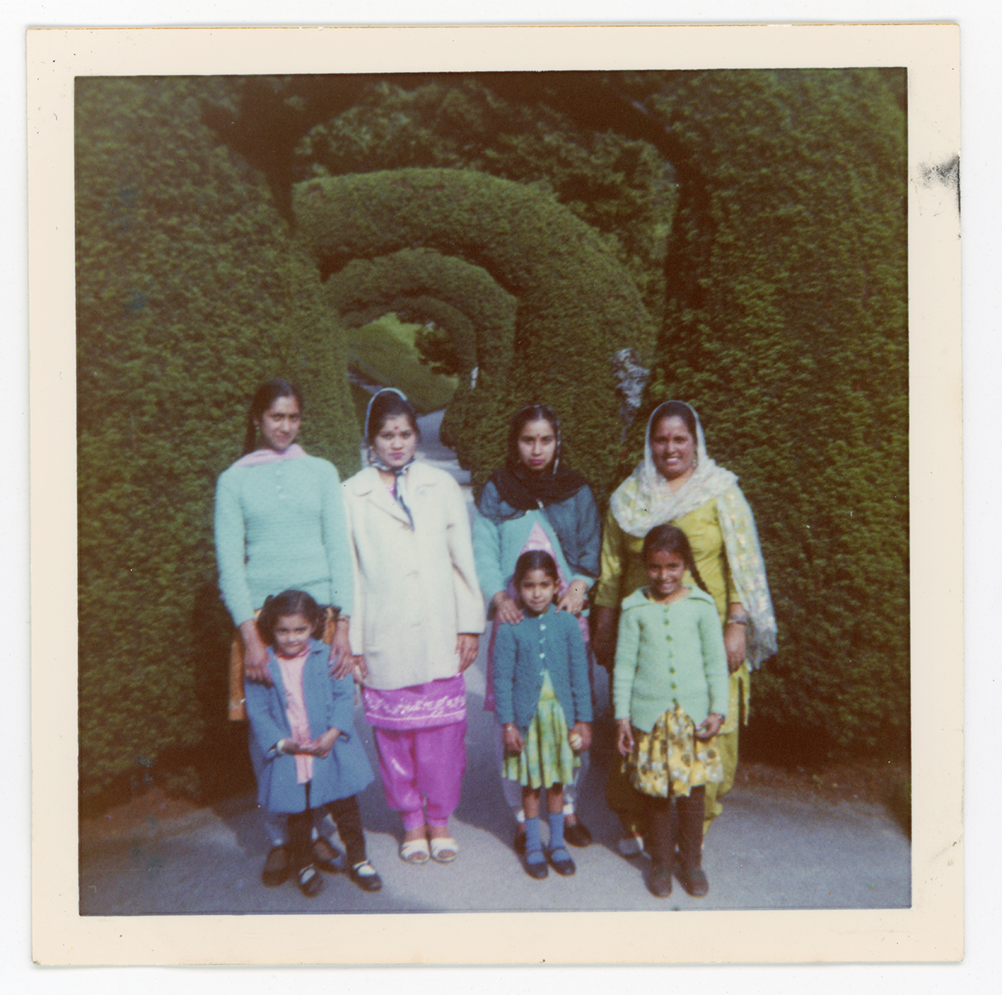A group of people pose for a photograph in the gardens of Alton Towers Theme Park, Derbyshire.