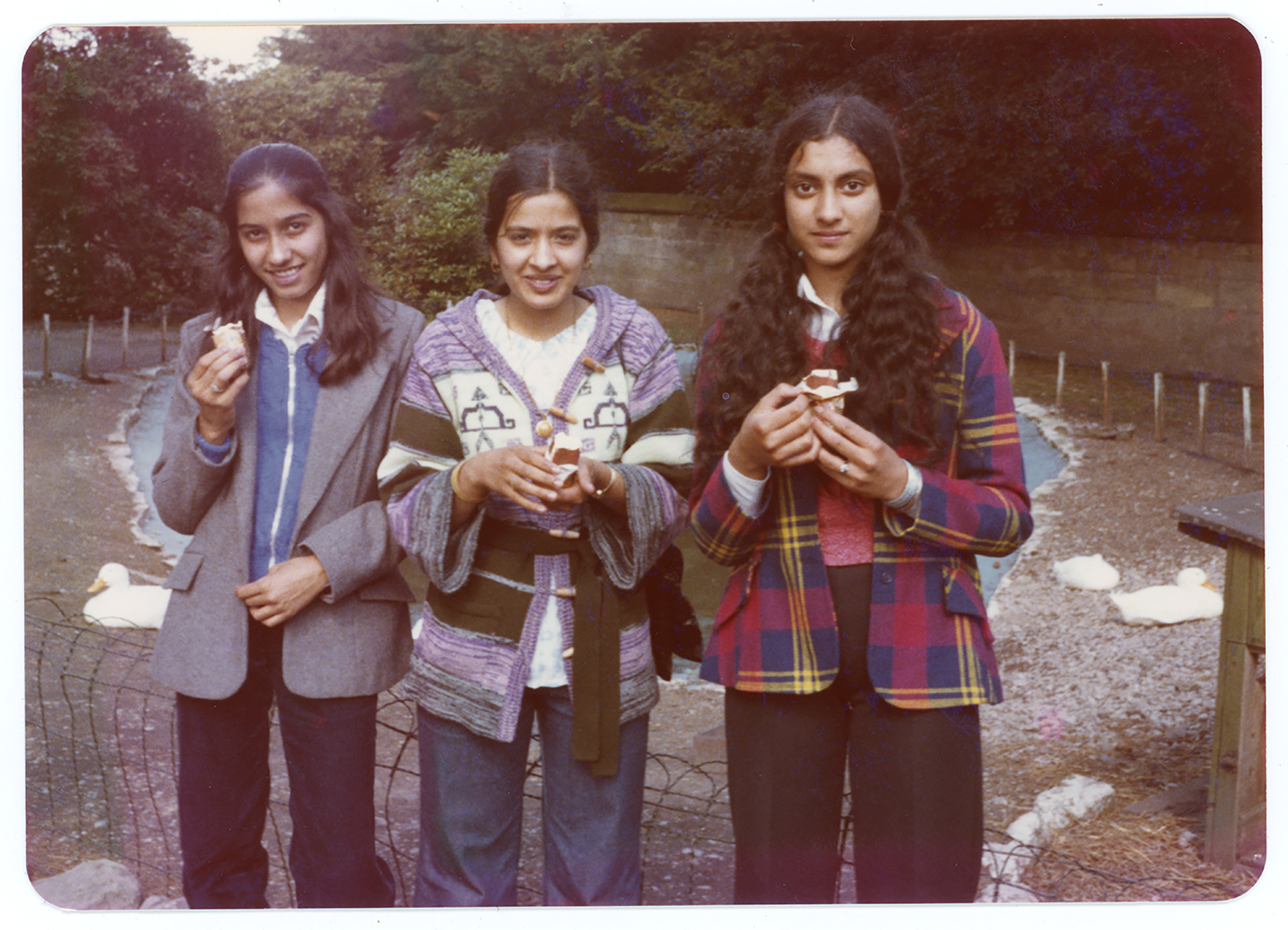 Three young people stand with cake at Alton Towers Theme Park in Derby.