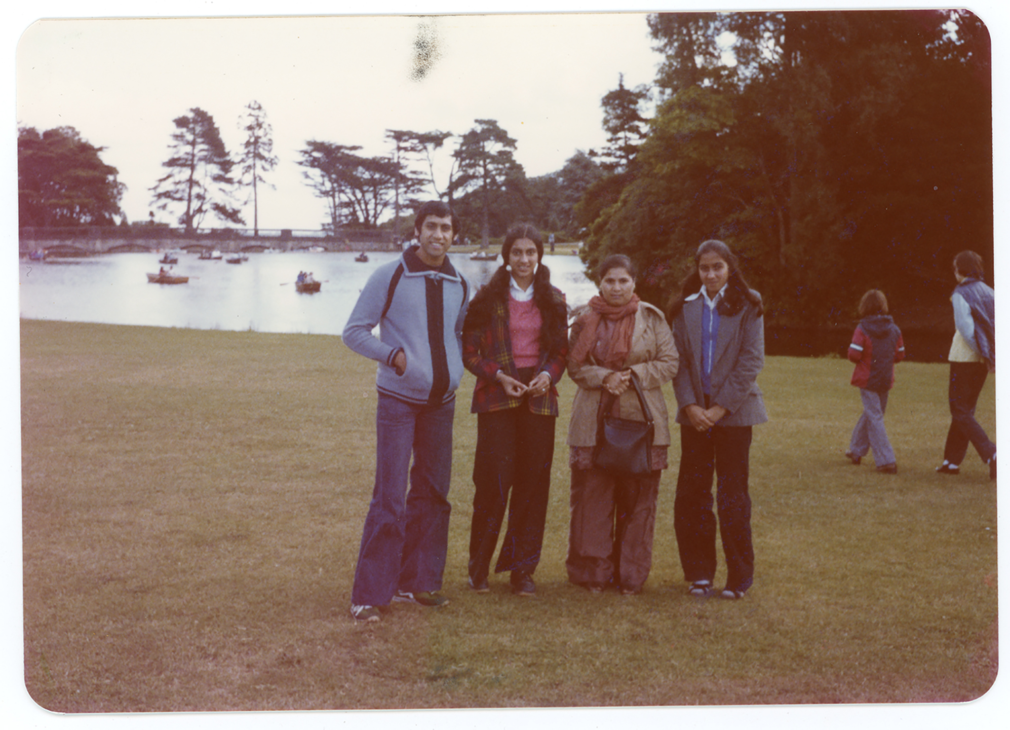 A group of people pose for a photograph in the gardens of Alton Towers Theme Park.