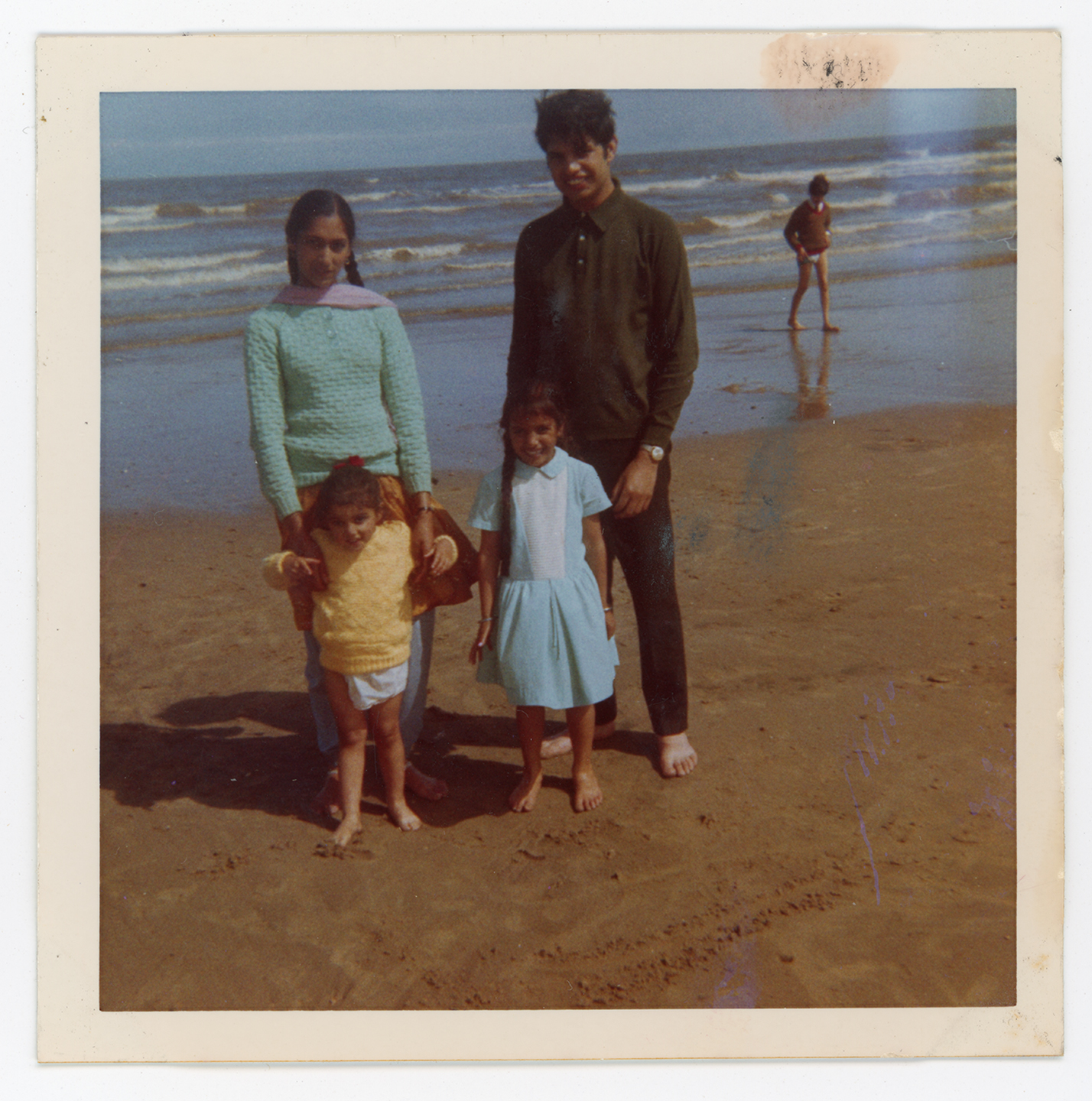 A family pose for a photo on Skegness beach.