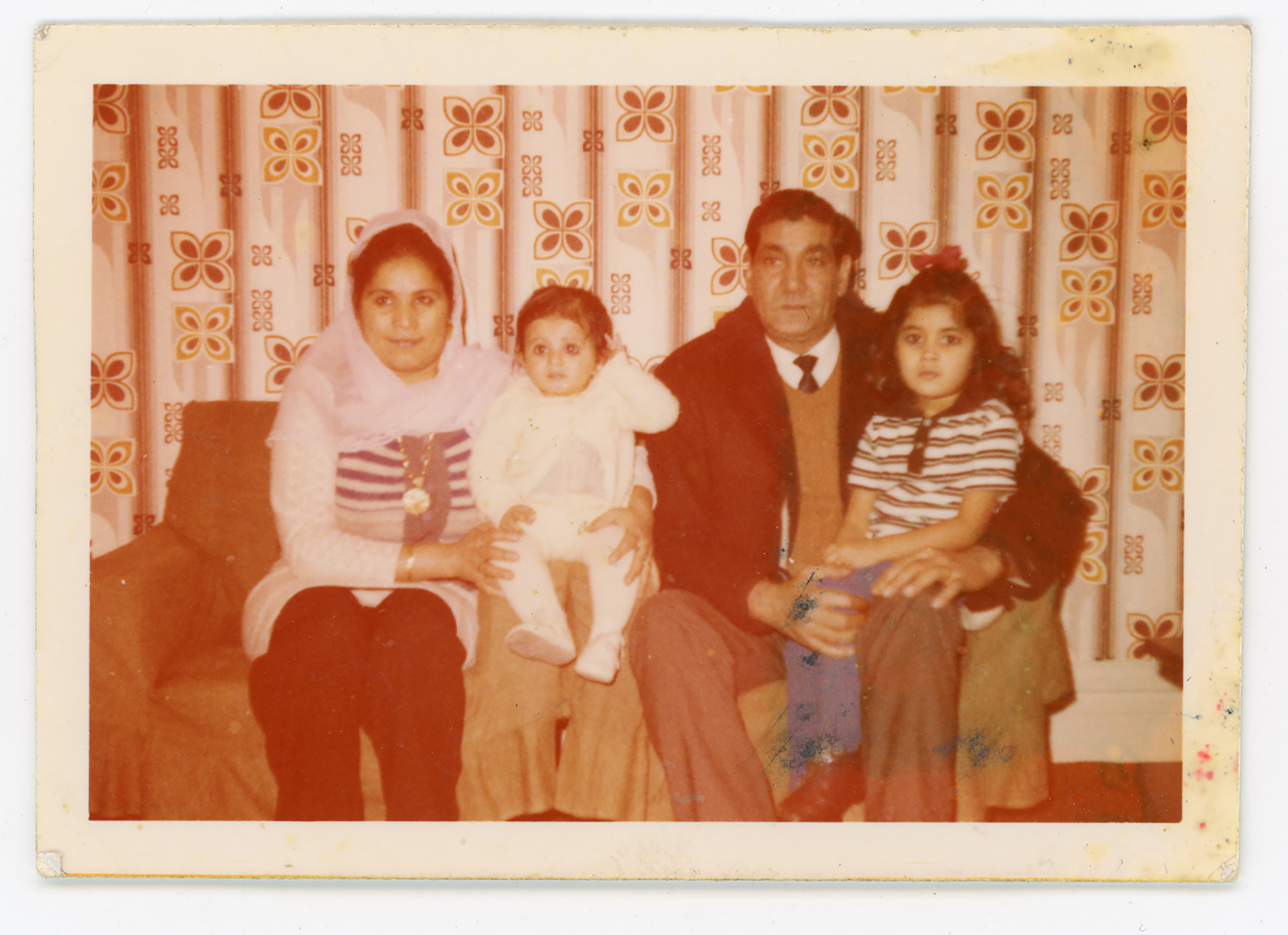A family pose for a photograph on a sofa. Taken in a house in Derby.