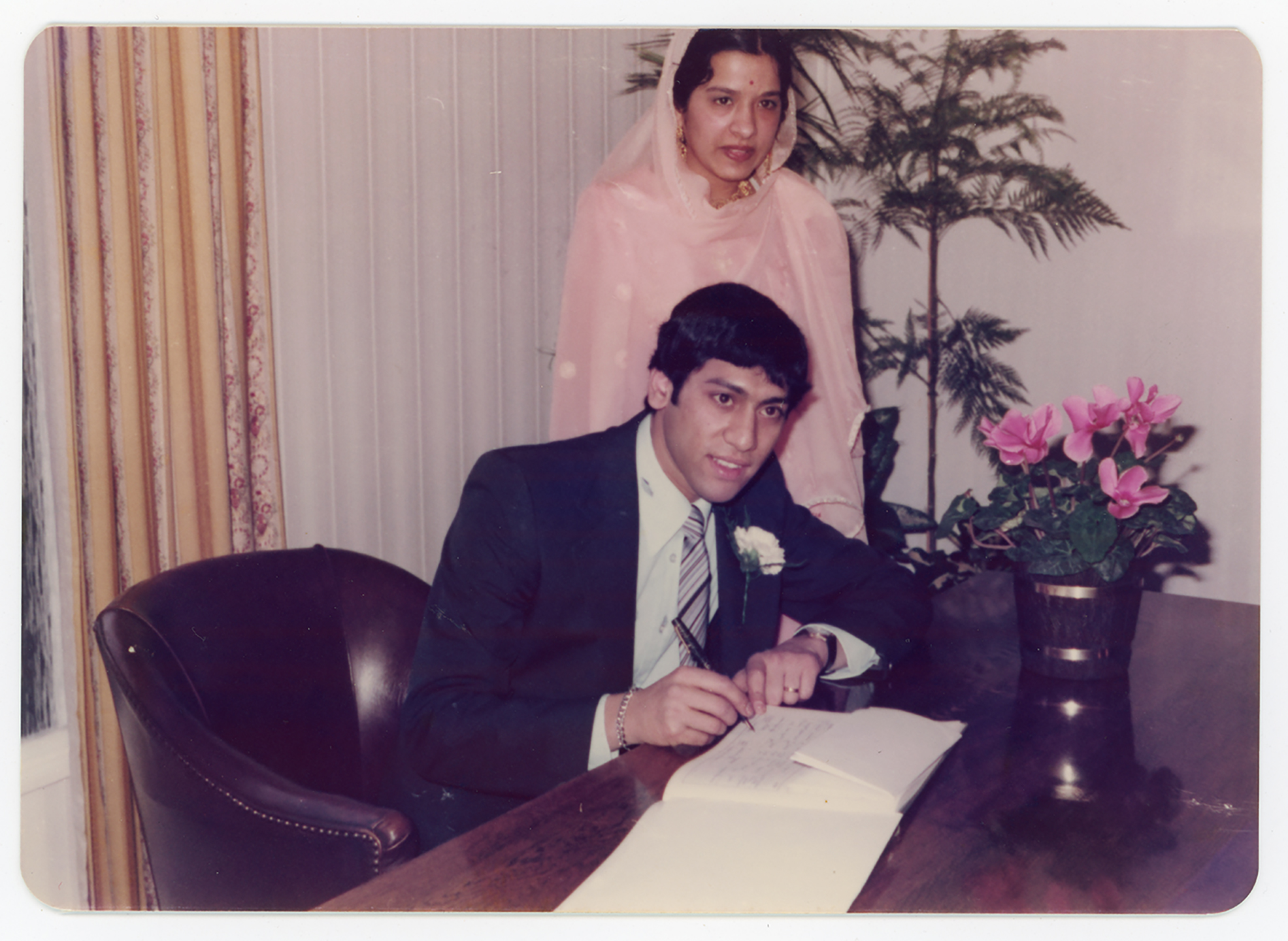 A young couple sign papers in Derby Registry Office.