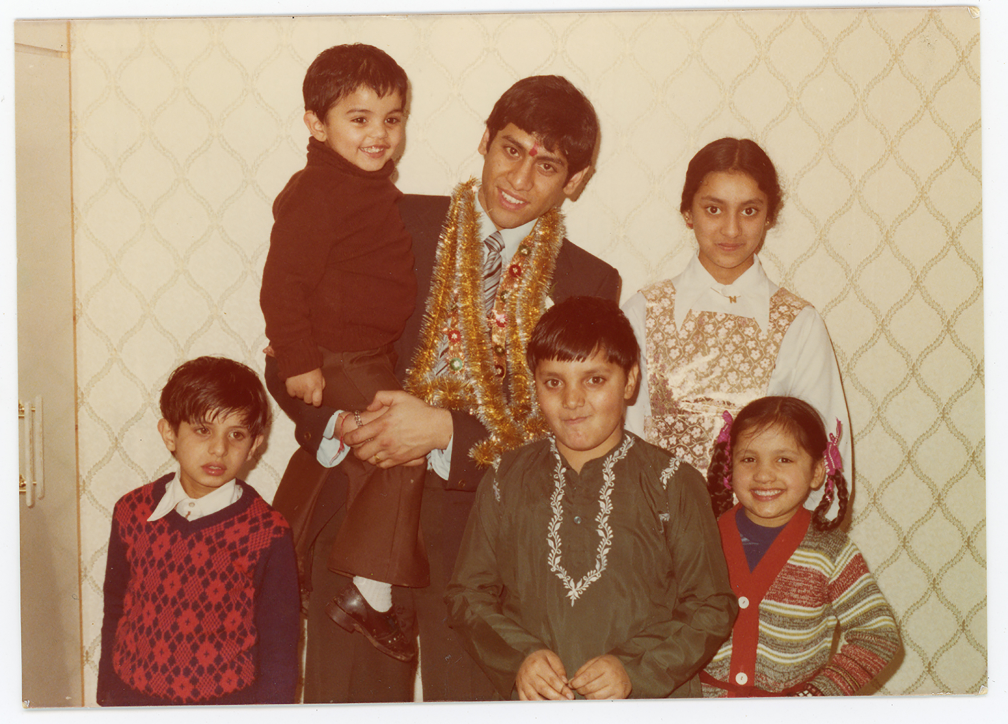 A family pose for a photo during wedding celebrations in their home in Derby.
