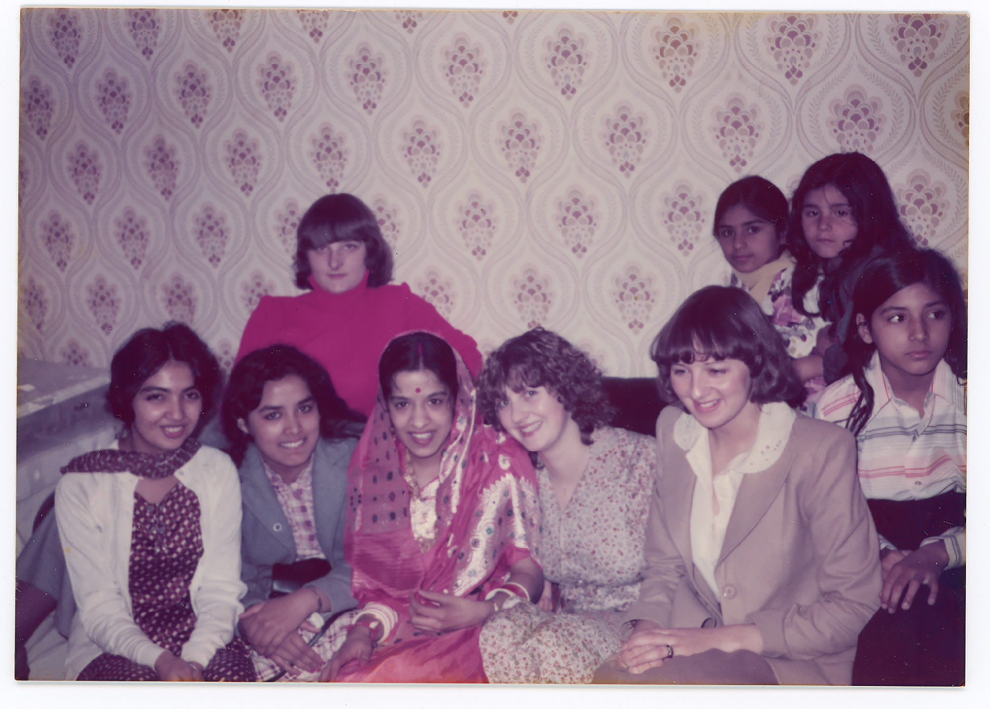 A group of people pose during wedding celebrations at a home in Derby.