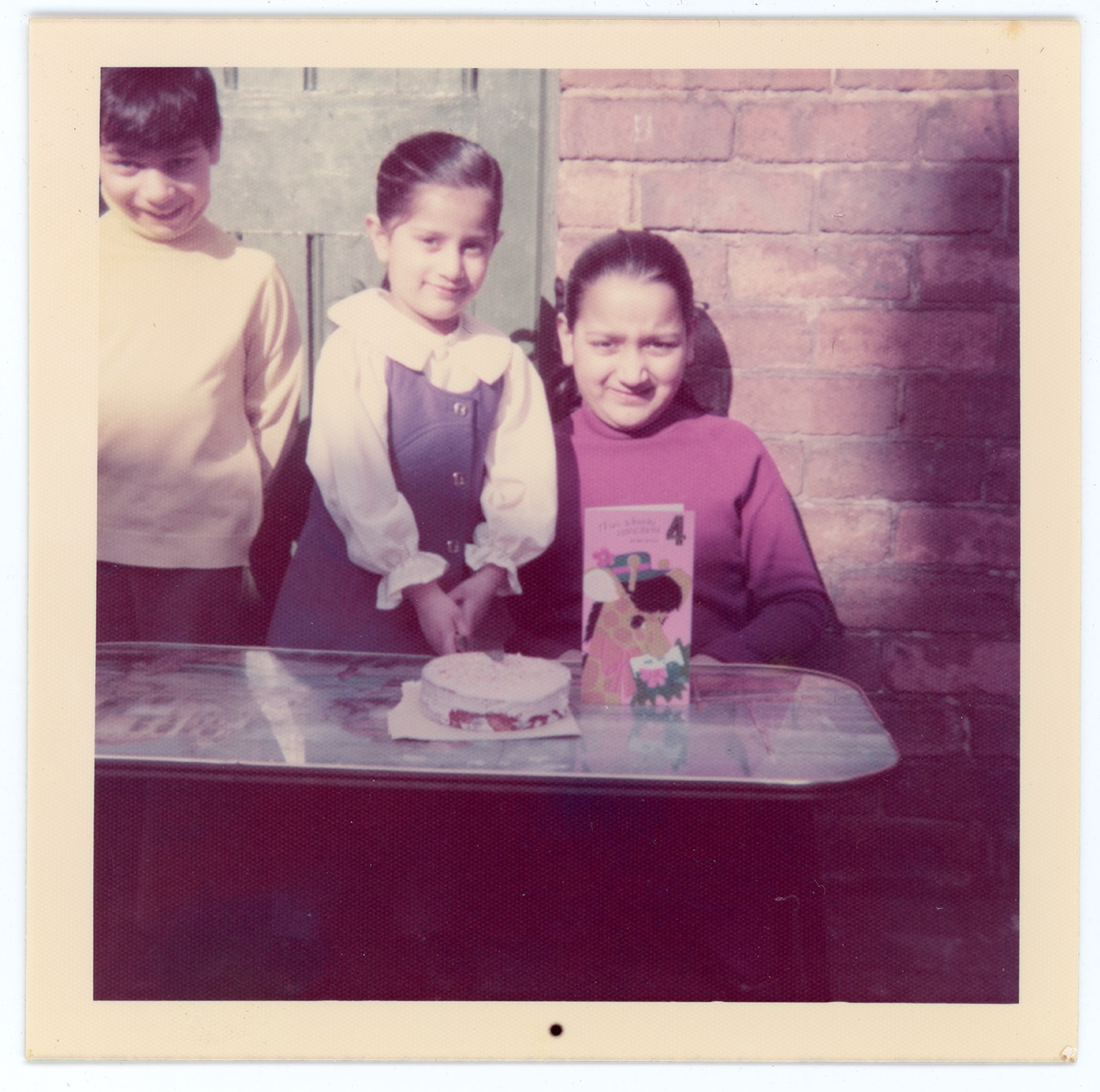 3 children celebrate a birthday by cutting into a birthday cake. Taken in Normanton, Derby.