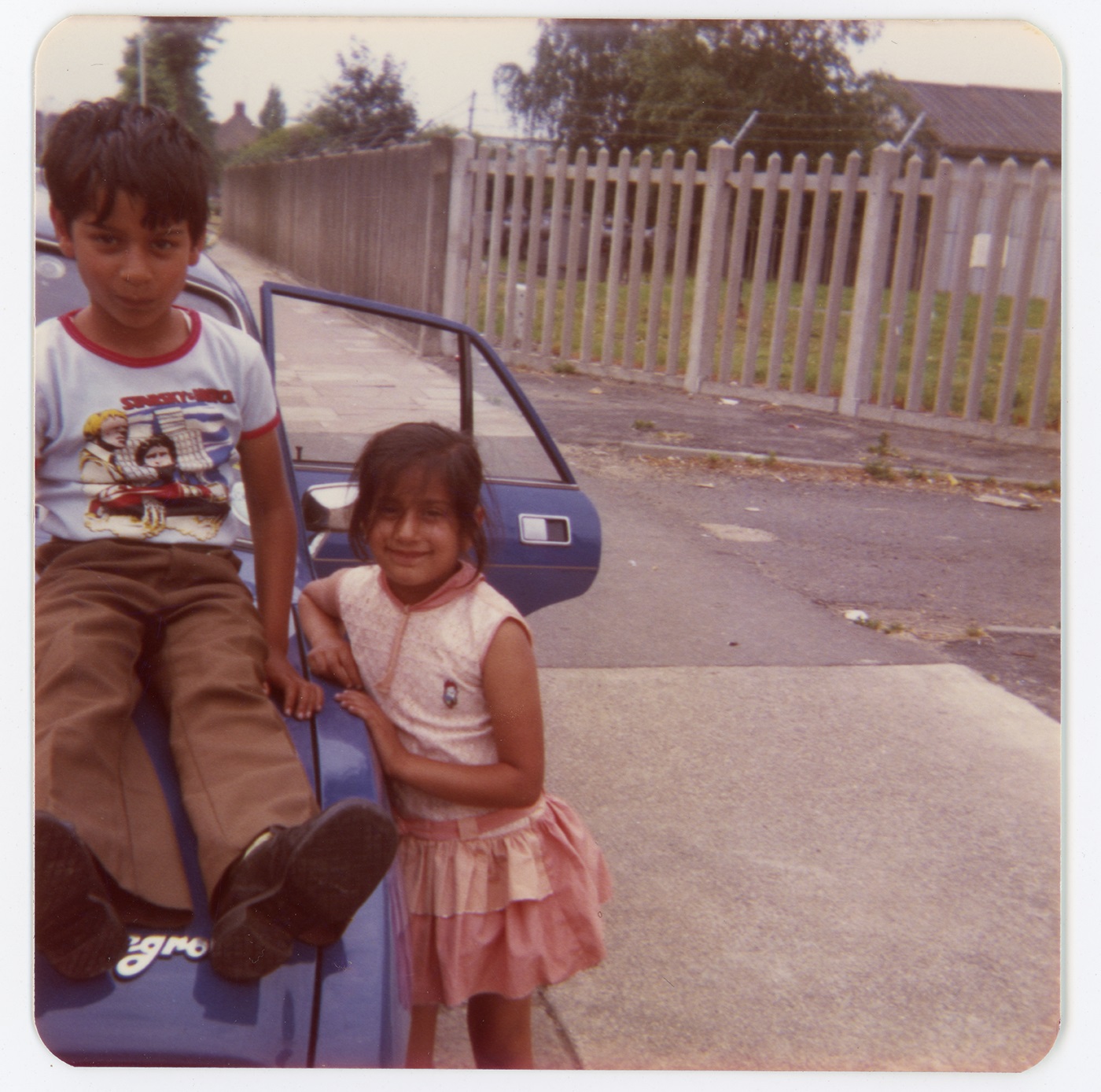 Two children pose in front of a parked blue car.